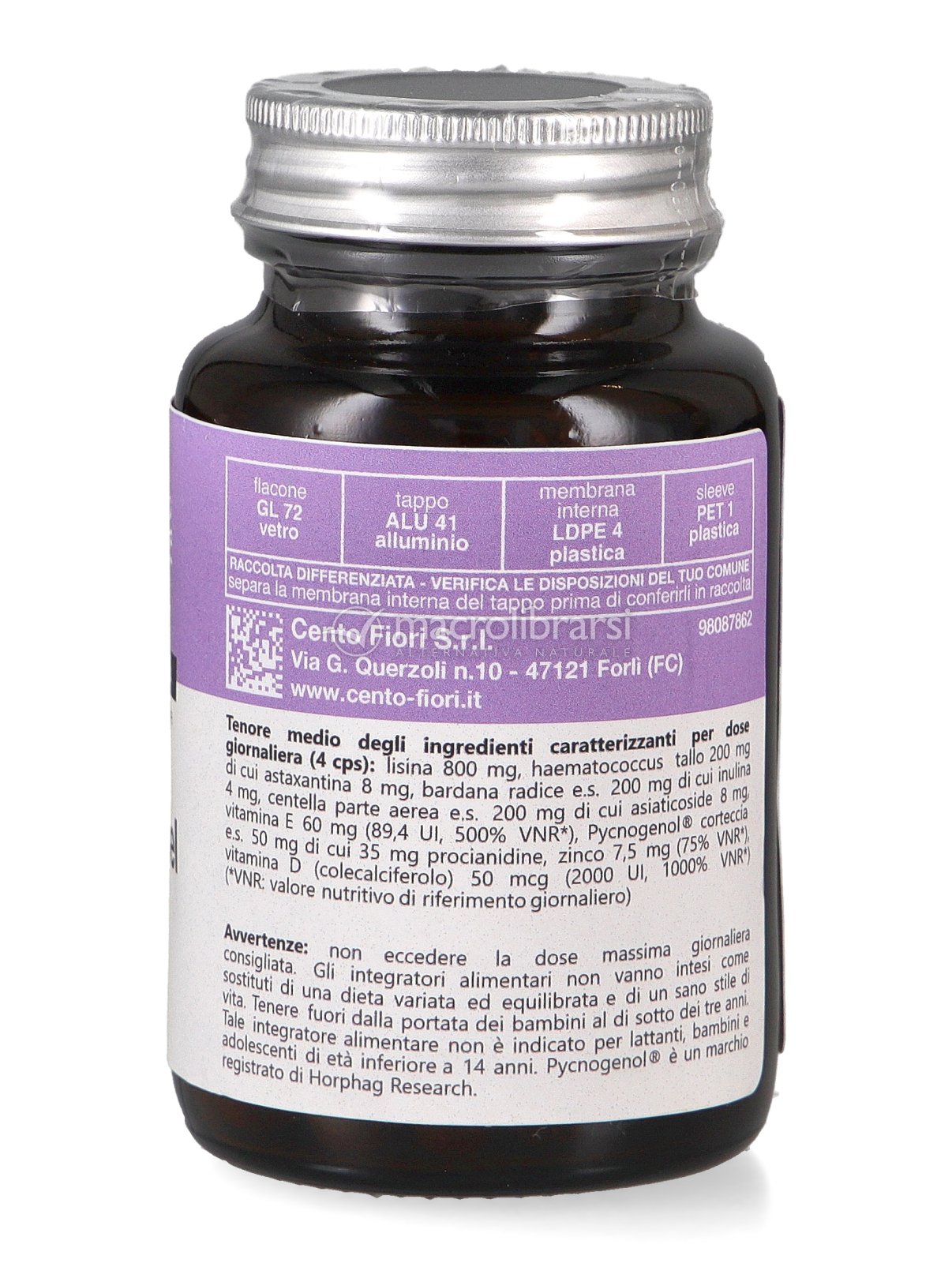 La formula include Haematococcus pluvialis e Pino marittimo (Pycnogenol®), noti per l’attività antiossidante, insieme a Bardana e Centella.