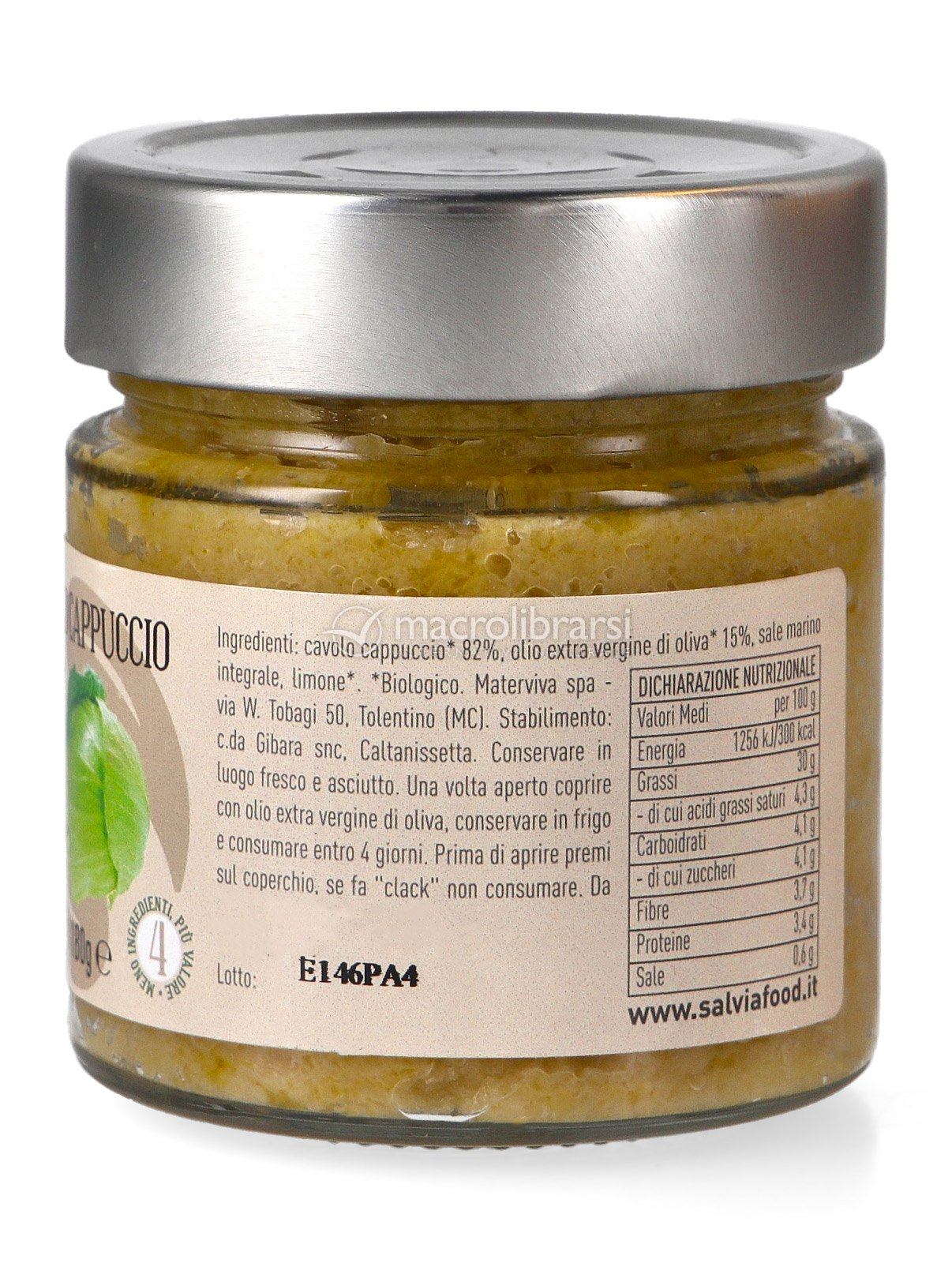 Cavolo cappuccio* 82%, olio extra vergine di oliva* 15%, sale marino integrale, limone*. *Biologico.