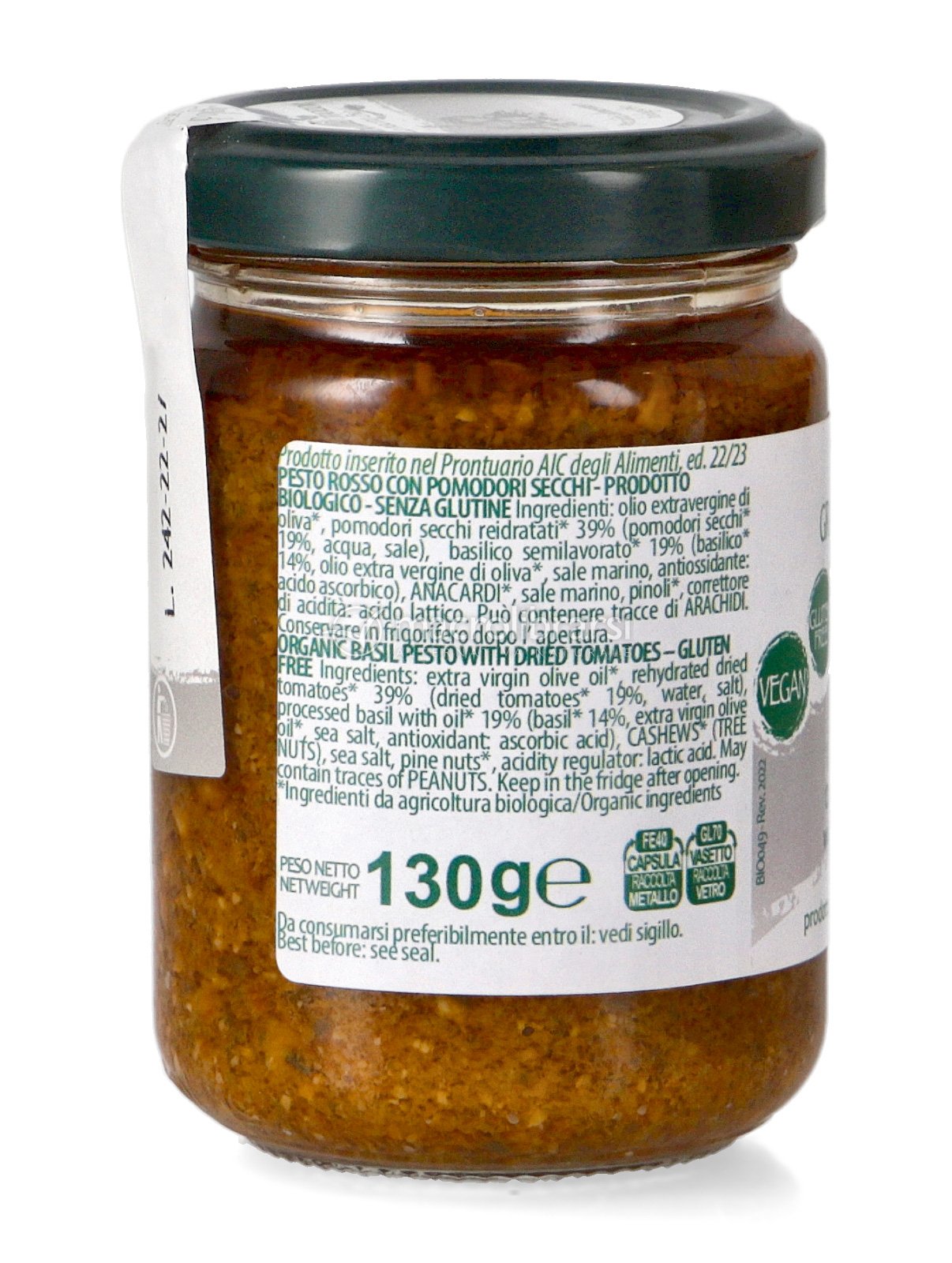 Olio extravergine di oliva*, pomodori secchi reidratati* 39% (pomodori secchi*, acqua, sale), basilico semilavorato* 19% (basilico 14%, olio extravergine di oliva*, sale marino, antiossidante: acido ascorbico), anacardi*, sale marino, pinoli*, correttore di acidità: acido lattico.