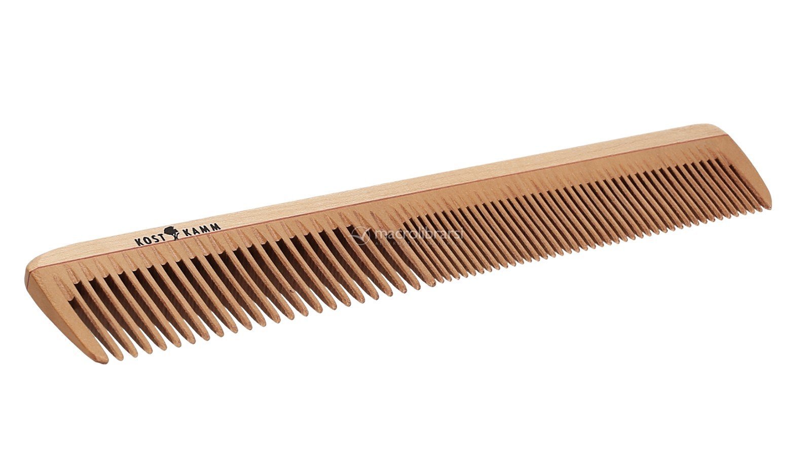 Un largo pettine di legno con denti di diverso spessore è pensato per prendersi cura e disciplinare diversi tipi di capello.