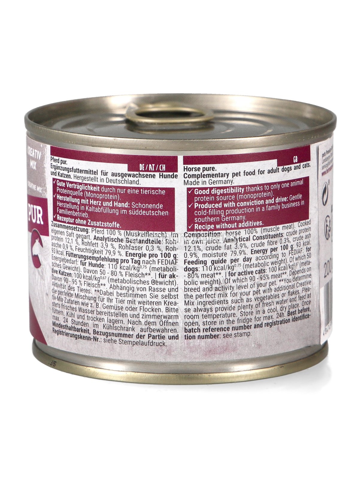 La ricetta senza cereali, glutine e lattosio contiene come unica fonte proteica la carne di cavallo, naturalmente povera di grassi e ricca di minerali, risultando un alimento ideale per le diete ad esclusione di cani e gatti che presentano disturbi metabolici, intolleranze alimentari ed allergie.