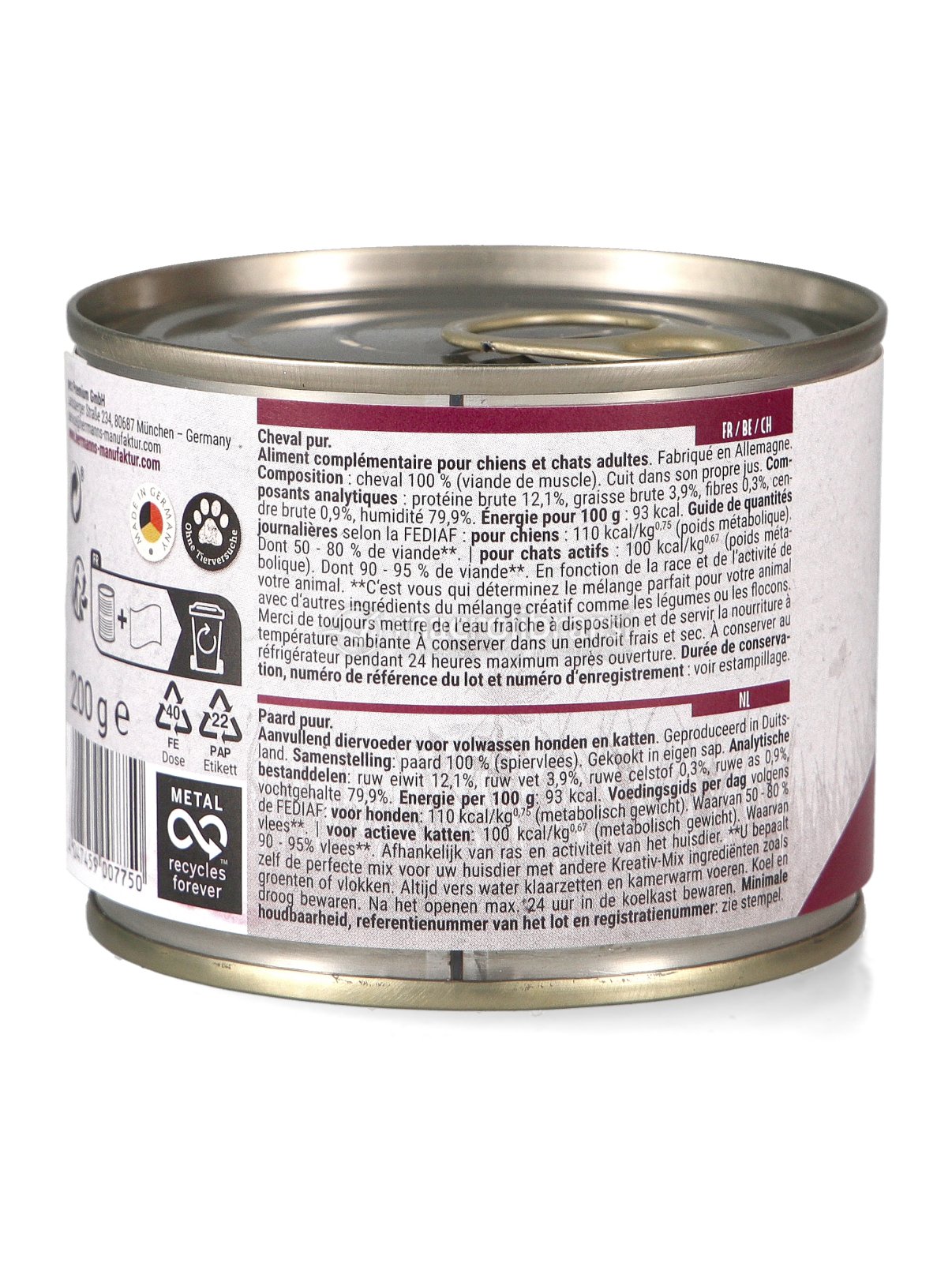 Umido complementare monoproteico per cani e gatti di tutte le età a base di sola carne di cavallo di altissima qualità cotta nel proprio brodo.