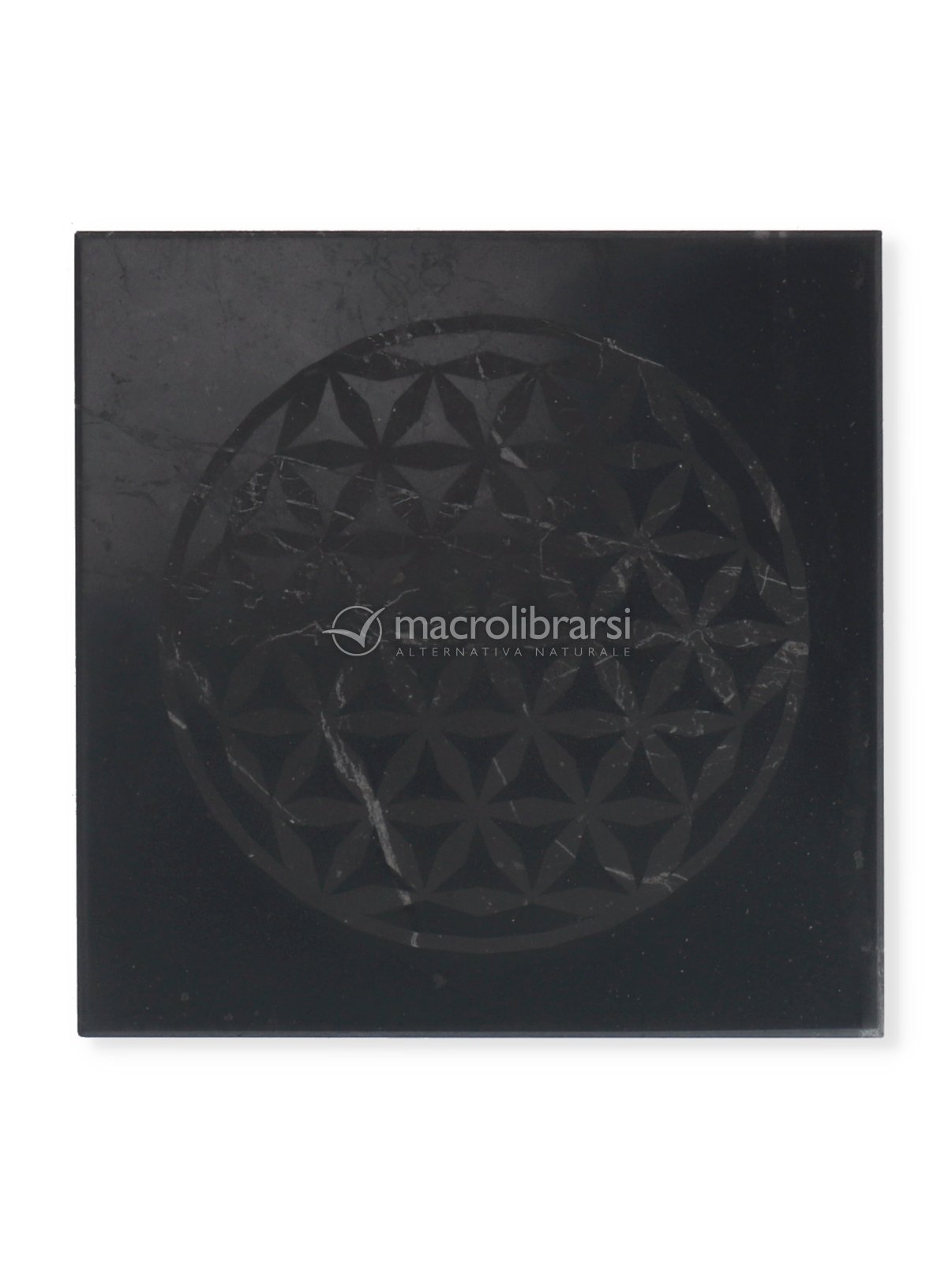 Questa piastrella quadrata in shungite nera di tipo II ha inciso a laser il leggendario e sacro Fiore della Vita.