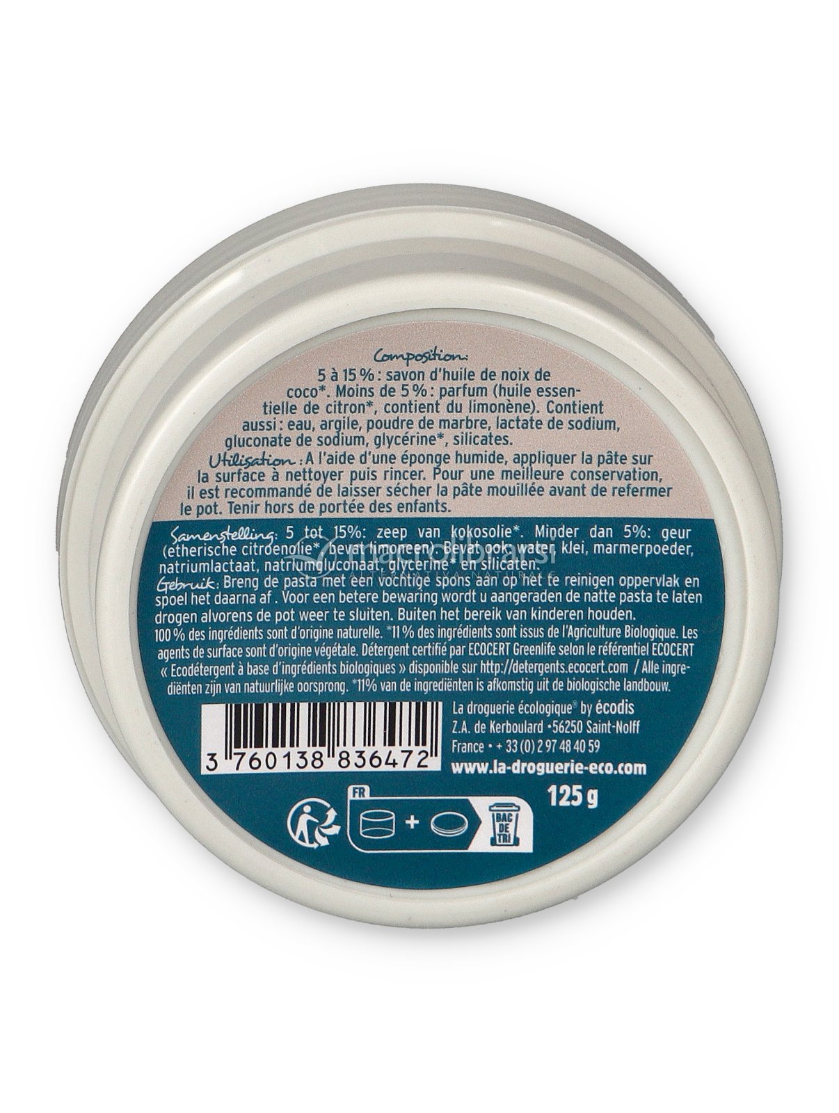 5-15%: sapone all'olio di cocco*. Meno del 5%: profumo (olio essenziale di limone*, contiene limonene). Contiene anche: acqua, argilla, polvere di marmo, lattato di sodio, gluconato di sodio, glicerina*, silicati. * origine naturale