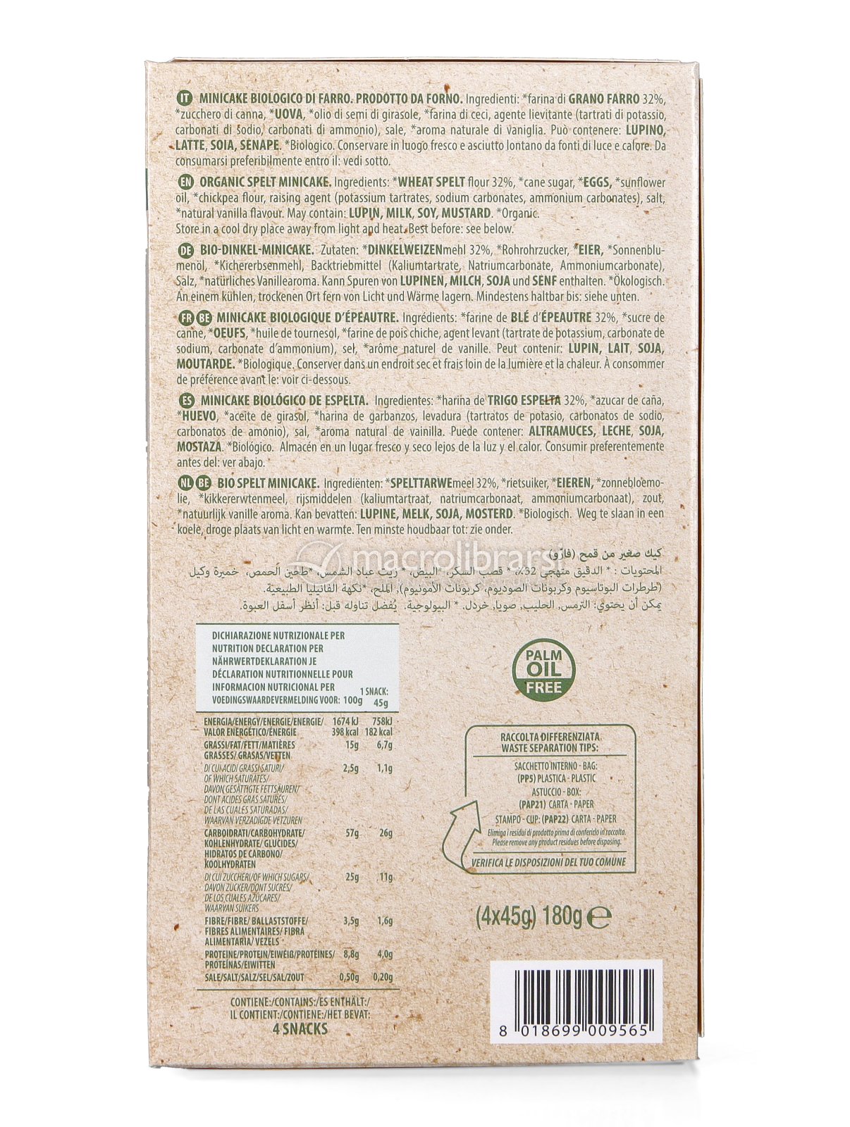 Farina di grano farro* 32%, zucchero di canna*, uova*, olio di semi di girasole* farina di ceci, agente lievitanti (tartrati di potassio, carbonati di sodio, carbonati di ammonio), sale, aroma naturale di vaniglia. *biologico.