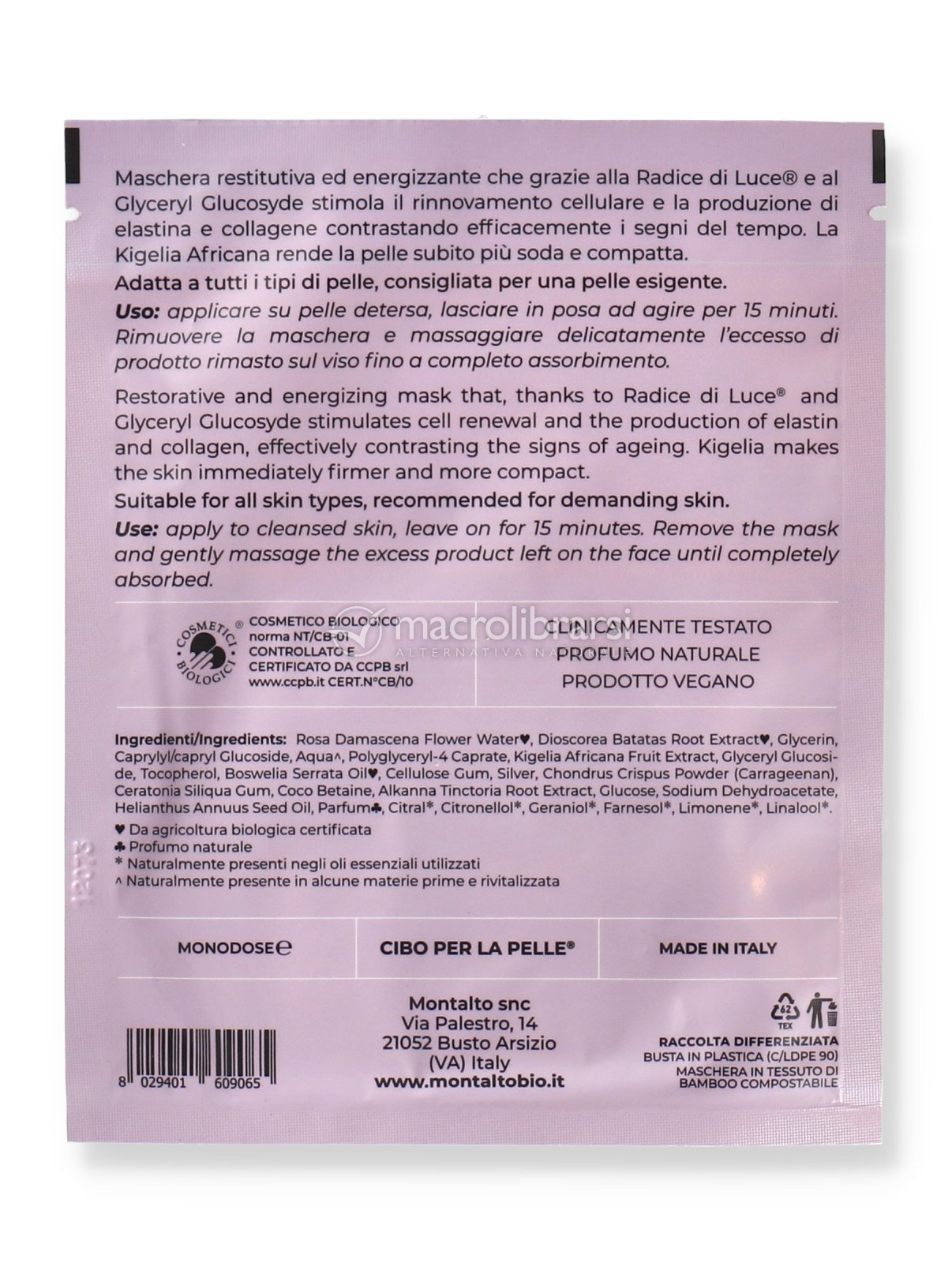 Questa maschera in morbido tessuto di bambù compostabile stimola la produzione di elastina e collagene e il rinnovamento cellulare contrastando efficacemente i segni del tempo e della stanchezza grazie alla sua formula a base di Radice di Luce® e Glyceryl Glucosyde, protettore del microbioma cutaneo che contribuisce a migliorare la levigatezza cutanea fino al 60%, l’idratazione fino al 49% e l’elasticità fino al 90%.