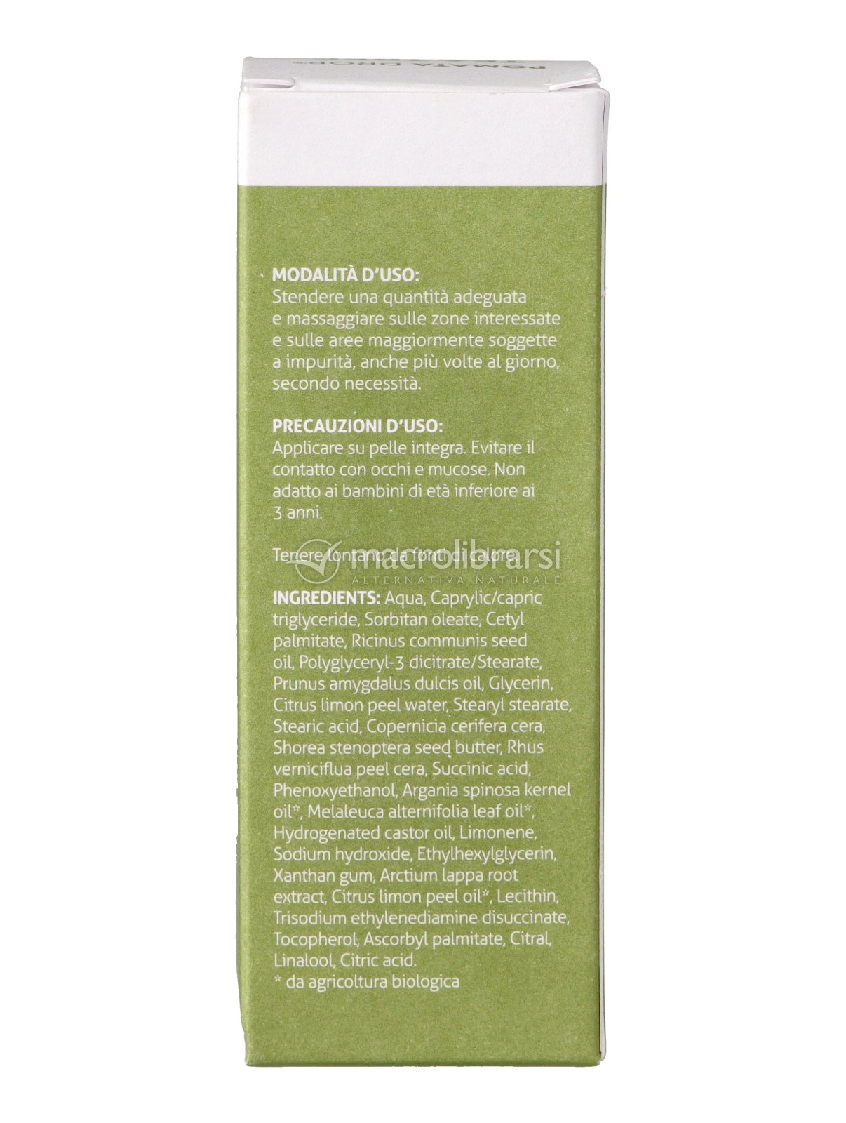 L'azione purificante è sostenuta dall'olio essenziale di Limone biologico, dall'estratto di Bardana e dall'acido succinico di origine naturale, utili in particolar modo su pelle impura.