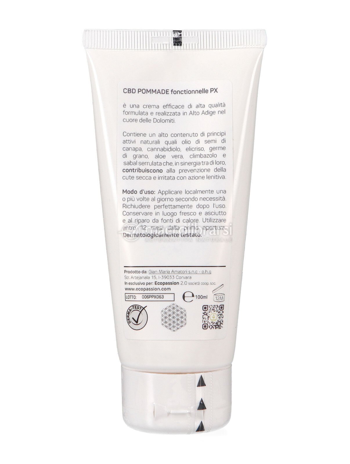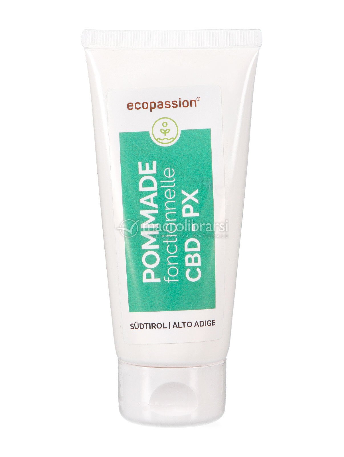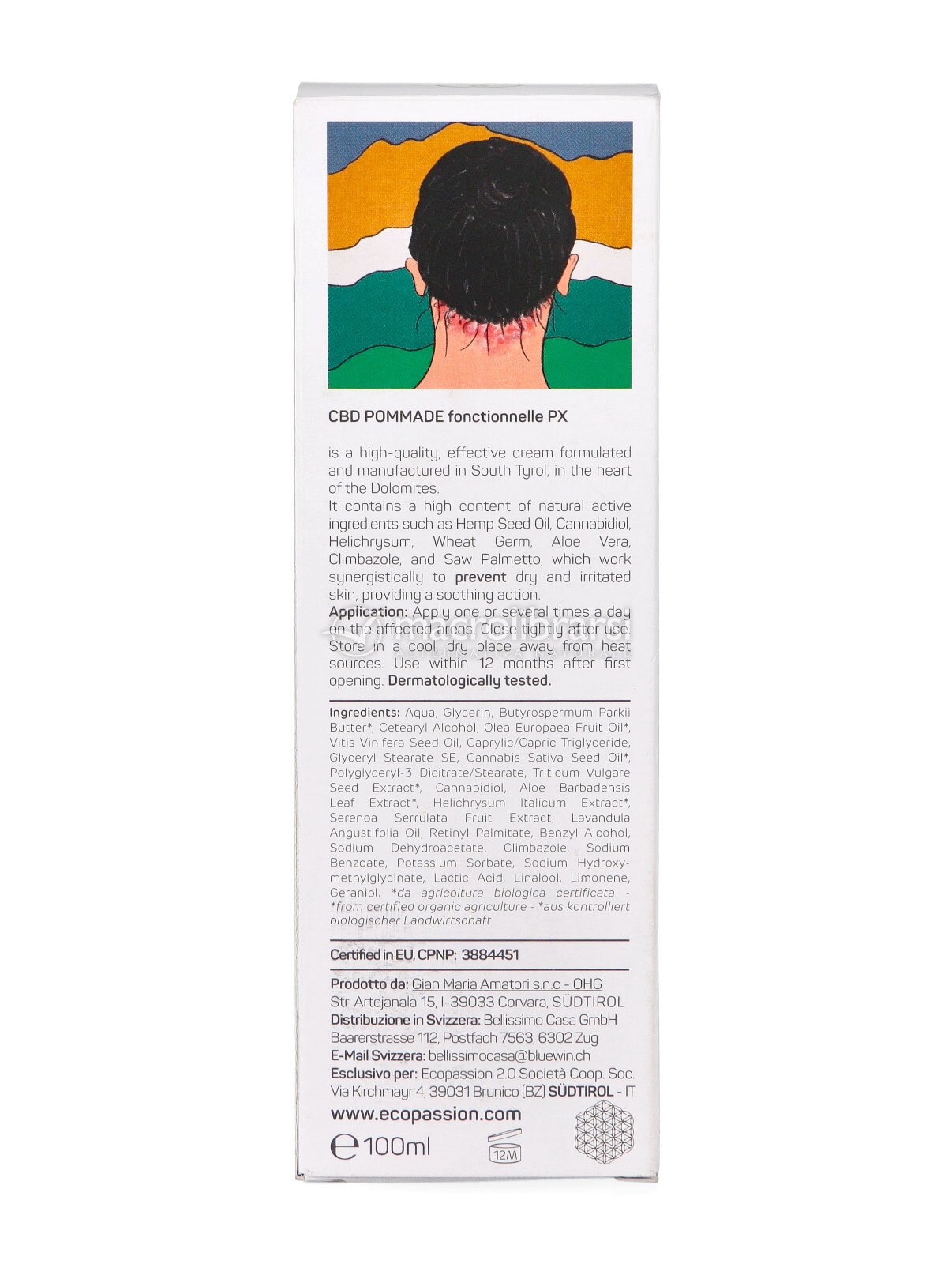 Ecopassion® POMMADE funzionale PX è una crema cosmetica funzionale di alta qualità, arricchita con isolato di CBD di origine vegetale, climbazolo ed estratti di piante officinali come elicriso, germe di grano, aloe vera, serenoa repens e lavanda.