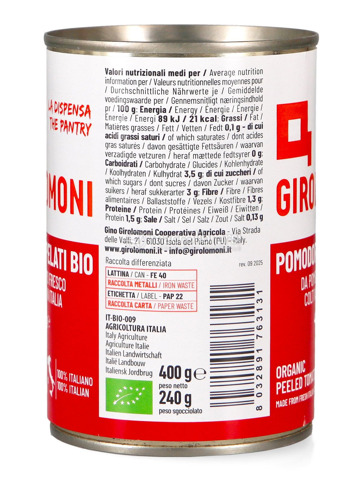 I Pomodori Pelati Bio Girolomoni sono ottenuti da pomodoro fresco 100% italiano, raccolto al giusto grado di maturazione, scottato e pelato, quindi confezionato entro 48 ore dalla raccolta per preservarne naturalità e sapore.