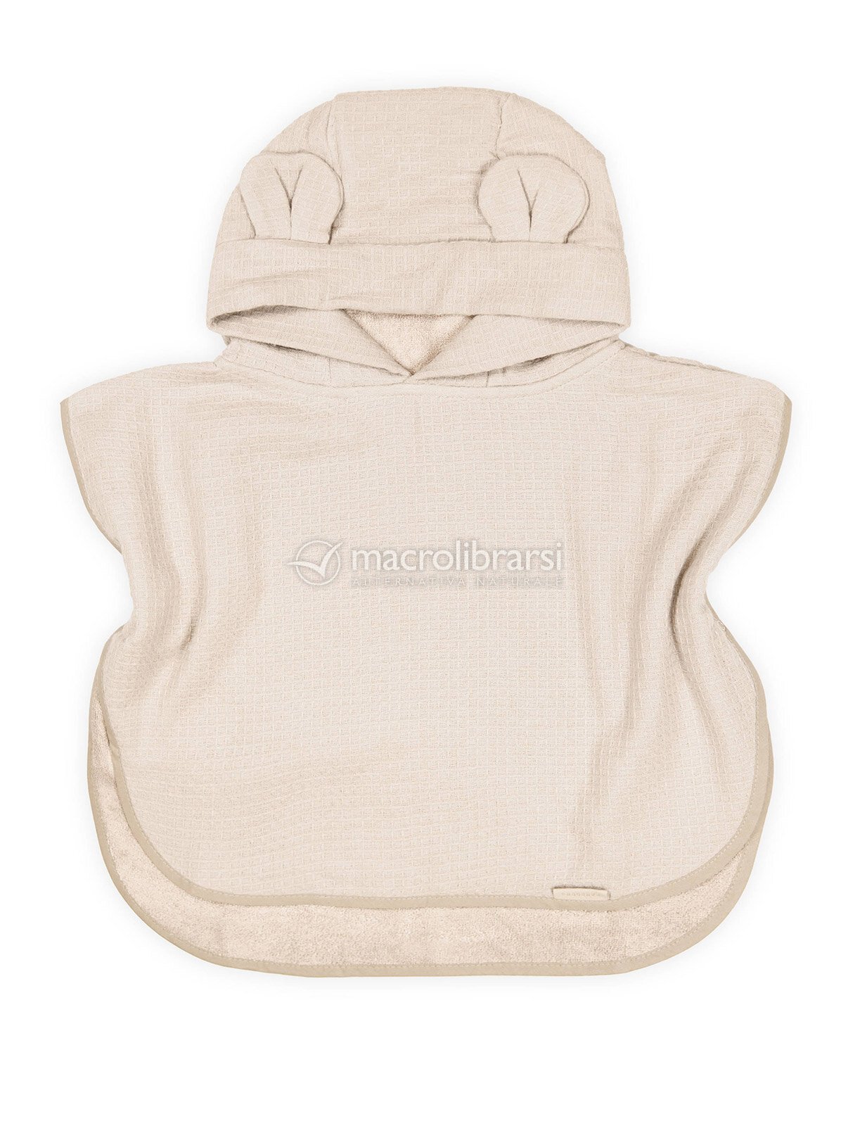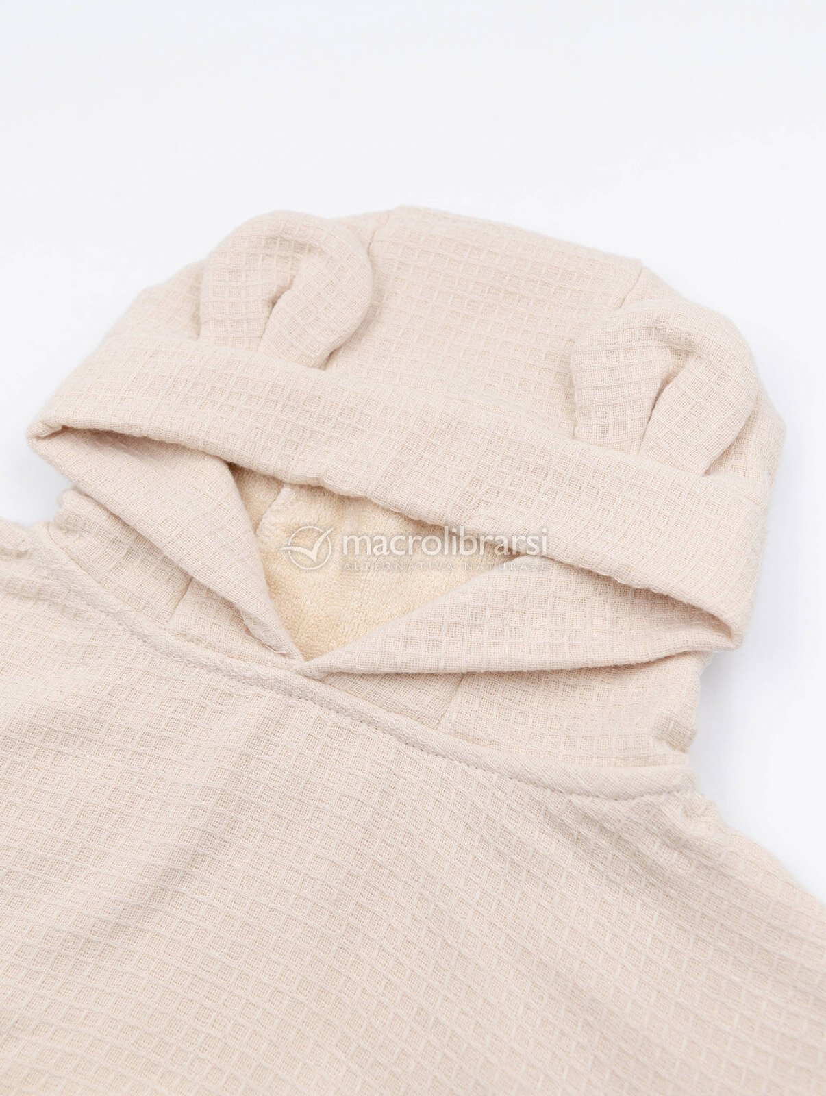 Realizzato in spugna di bambù e cotone con lavorazione waffle, questo poncho color panna avvolge i più piccoli in un abbraccio morbido e naturale dopo il bagnetto o un tuffo in piscina.