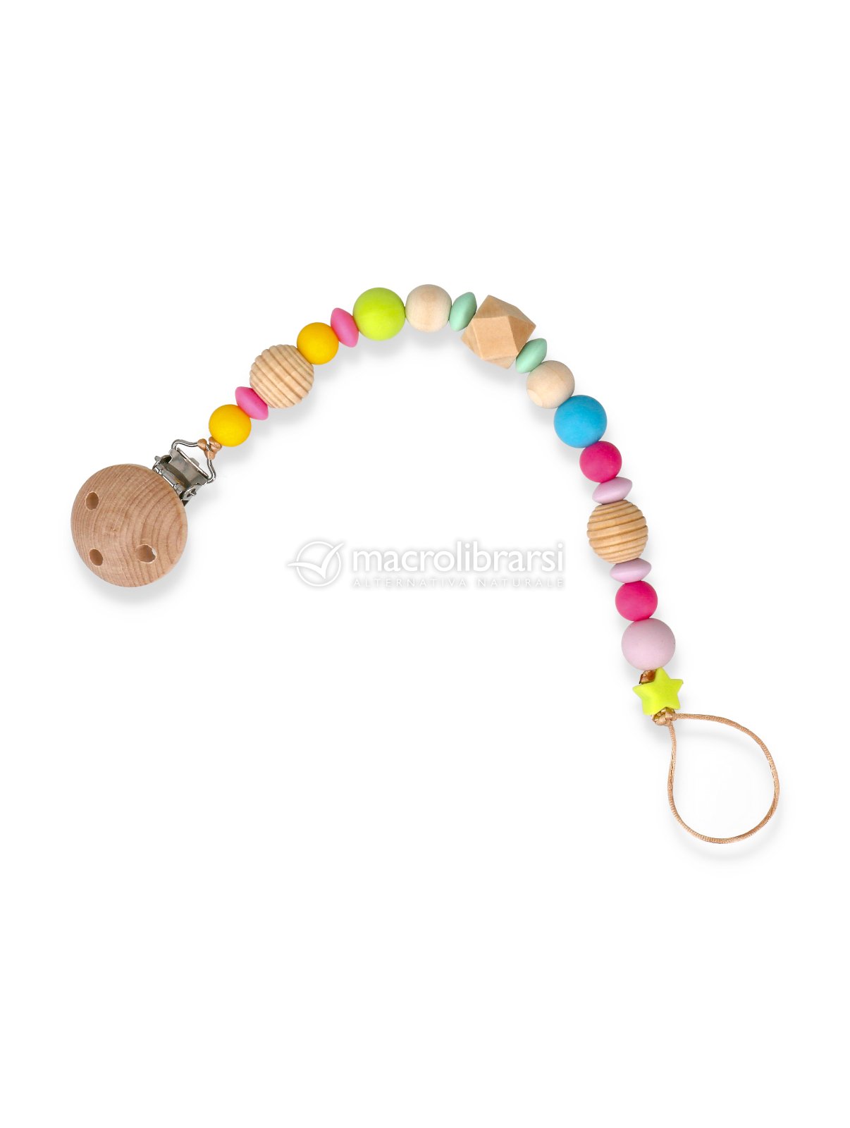È un accessorio indispensabile per evitare che ciuccio o succhietto cadano a terra sporcandosi o che vadano persi.