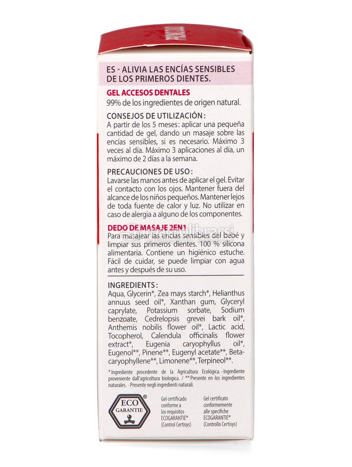 Il gel per gengive “Gel eruzione dei denti da latte” è un prodotto dal sapore gradevole, senza zucchero e senza alcol, formulato con oli essenziali biologici di katafray, camomilla nobile e chiodi di garofano, uniti al macerato oleoso di calendula.