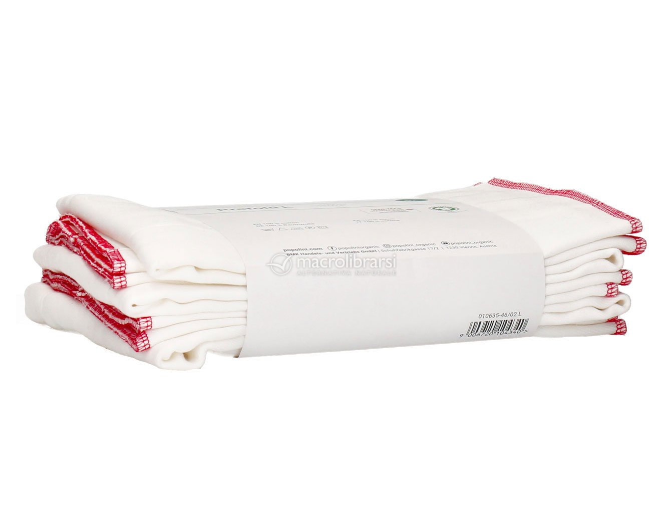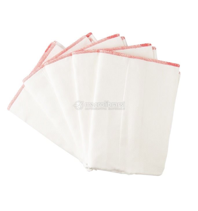 Si tratta di rettangoli di cotone costituiti da vari strati di tessuto sovrapposti (4 strati ai lati per facilitare la piegatura, 8 strati nella parte centrale per ottenere la massima assorbenza).