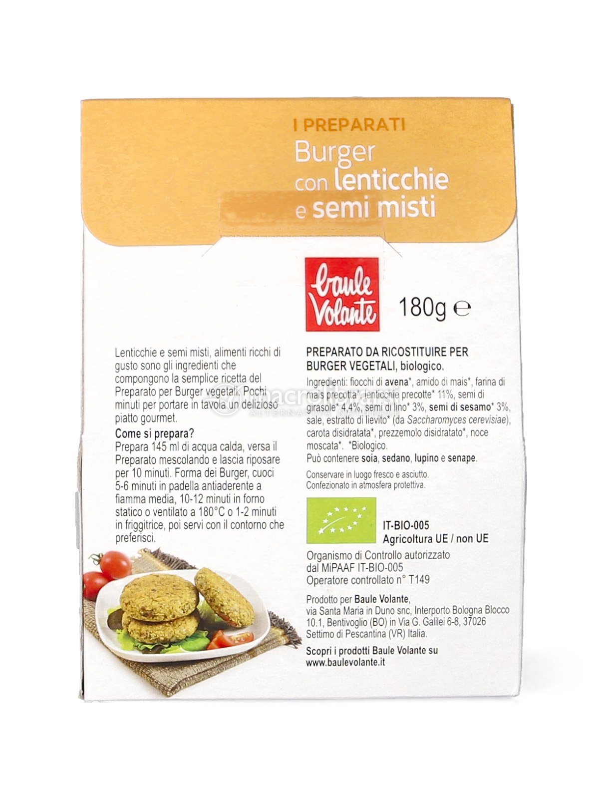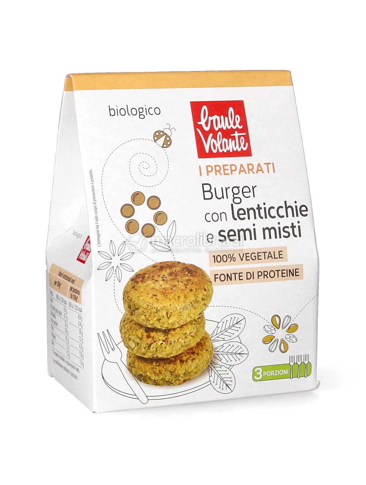 Il Preparato per Burger di Lenticchie e Semi Misti di Baule Volante è un composto istantaneo 100% vegetale: ideale per cucinare deliziosi veggie burger che faranno impazzire grandi e piccini!