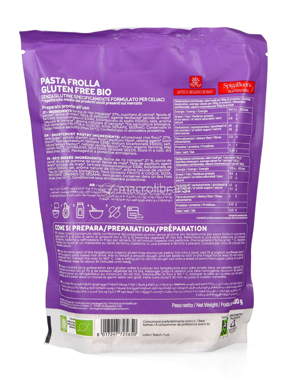 Specificamente formulato per celiaci, è prodotto in Italia con ingredienti biologici selezionati. Perfetto come base per crostate alla frutta, frollini da colazione o dolci da forno fatti in casa.
