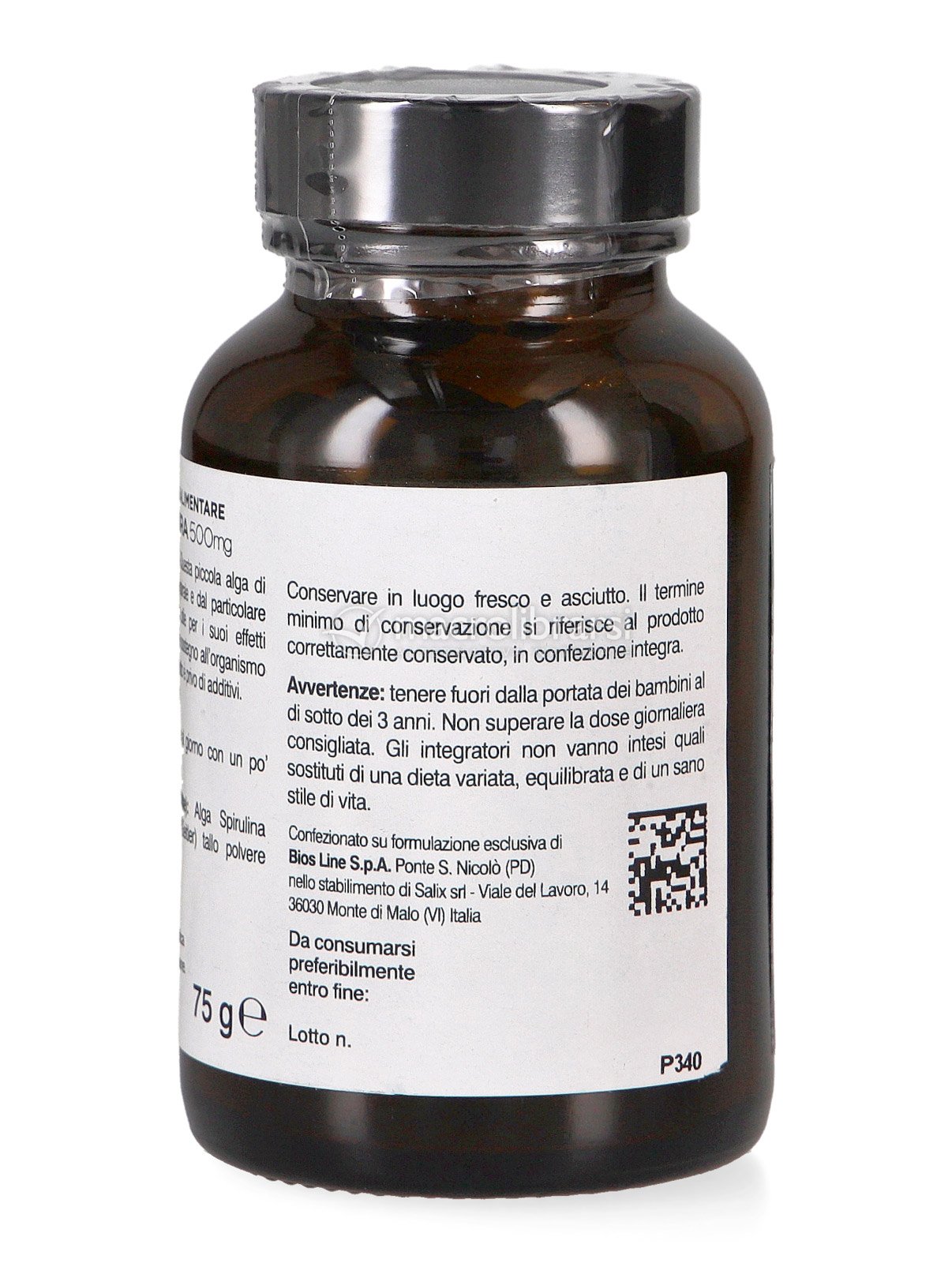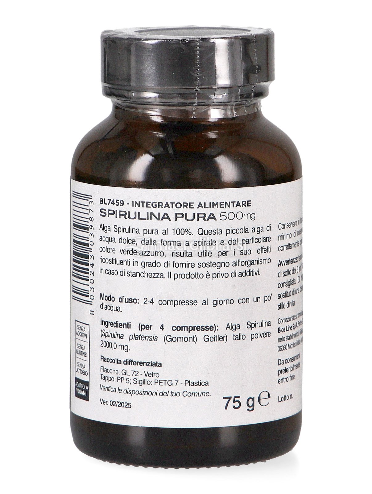 Spirulina Pura 500 mg di Bios Line contiene polvere di alga Spirulina 100% pura, in pratiche compresse senza additivi, senza glutine o lattosio, adatte a chi segue una dieta vegana.