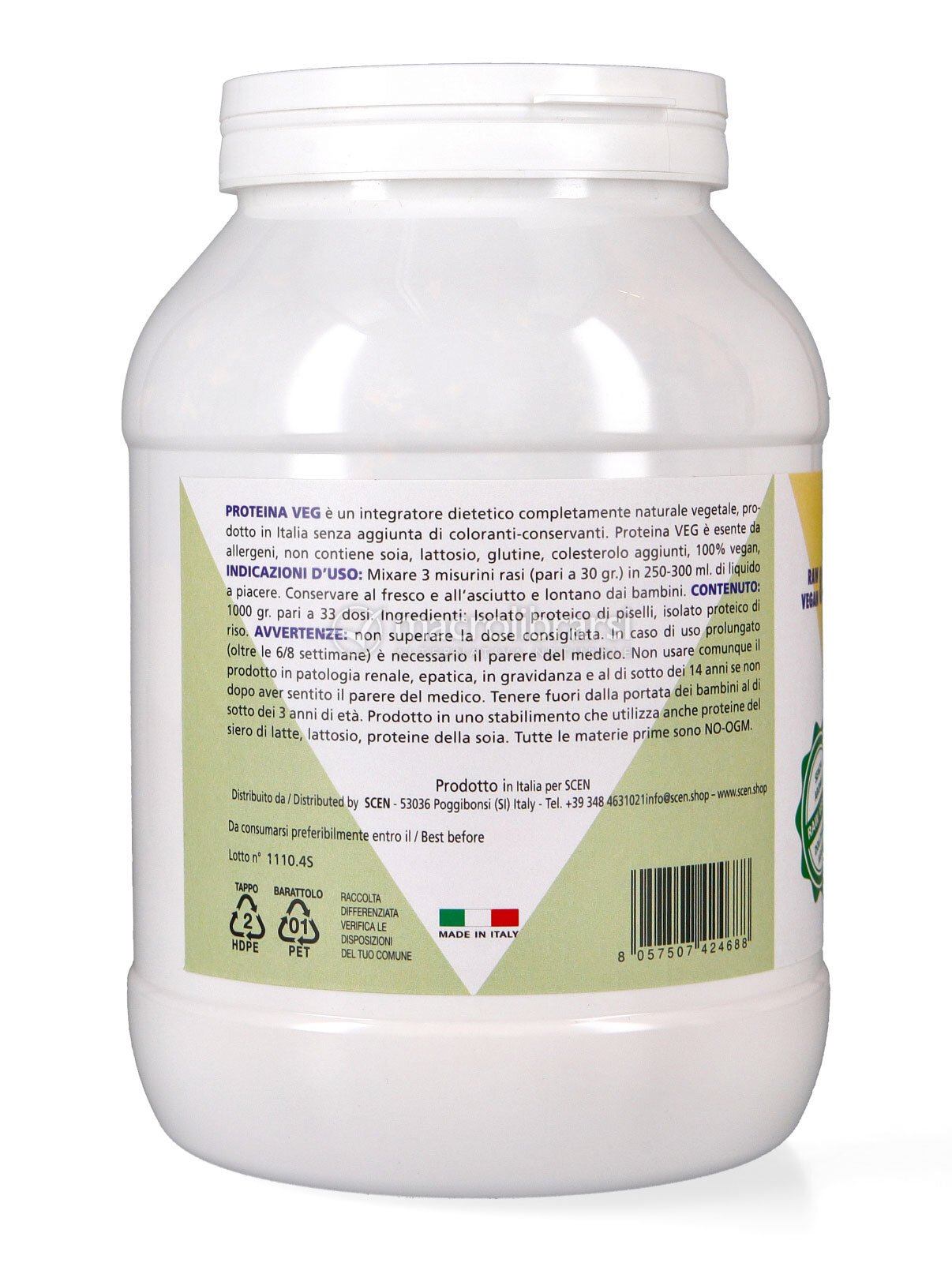 PROTEINA VEG si distingue per l’alta digeribilità, il basso indice glicemico e l’ottima assimilazione. Contiene 82 g di proteine vegetali ogni 100 g di prodotto ed è adatta sia a vegetariani che a vegani. Inoltre, non contiene glutine, lattosio, soia, proteine del latte, colesterolo aggiunti né ingredienti di origine animale come latticini, uova o miele. Tutte le materie prime utilizzate sono non OGM e il prodotto è privo di conservanti.