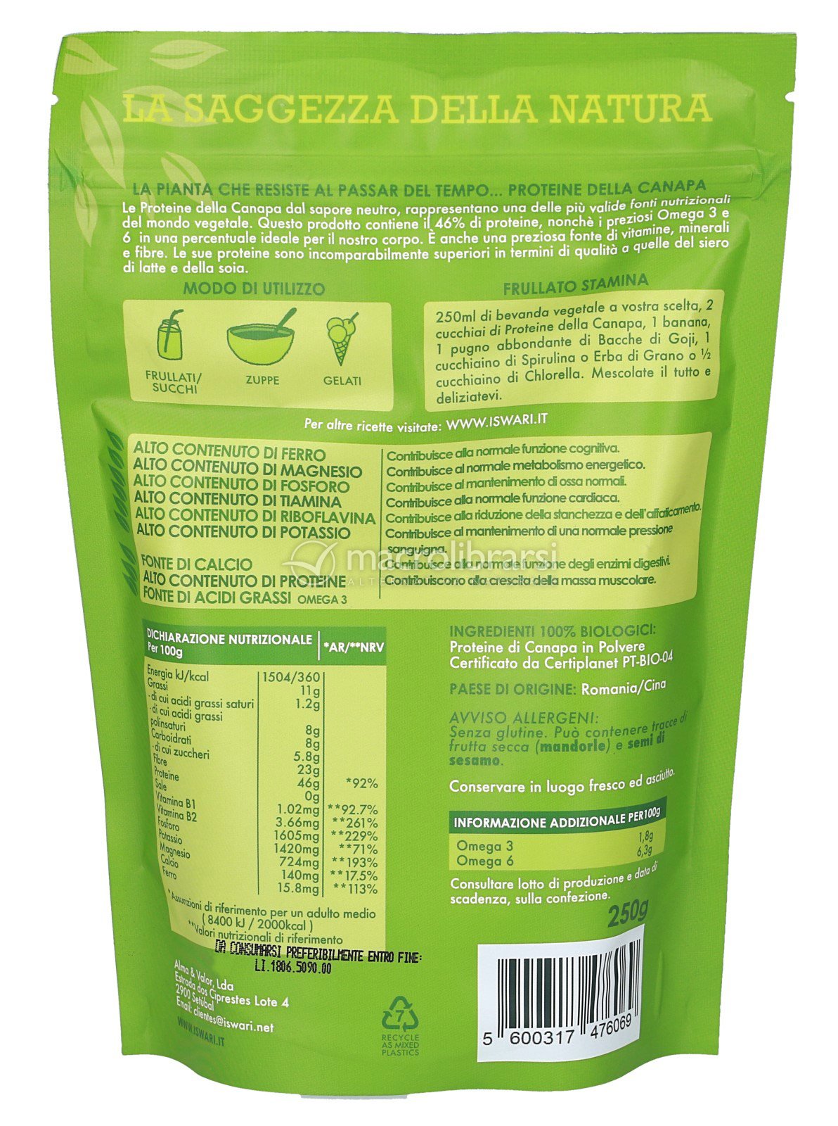 La canapa, a differenza delle proteine animali, contiene acidi grassi essenziali nel rapporto perfetto, sali minerali, vitamine ed enzimi che la rendono particolarmente digeribile e assimilabile.