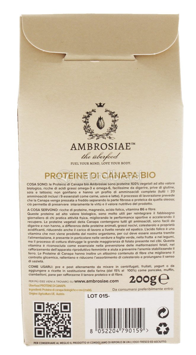 Le Proteine di Canapa bio Ambrosiae sono proteine 100% vegetali ad alto valore biologico, ricche di acidi grassi omega-3 e omega-6, facilissime da digerire, prive di glutine, soia e lattosio; non gonfiano e hanno un profilo di amminoacidi completo
