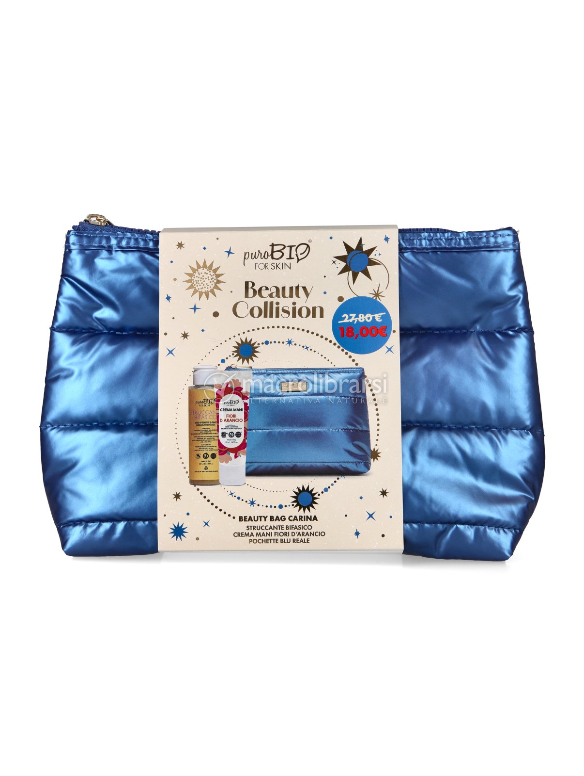 | Confezione | Struccante bifasico (100 ml) + Crema mani Fiori d'Arancio (50 ml) + Pochette blu reale |