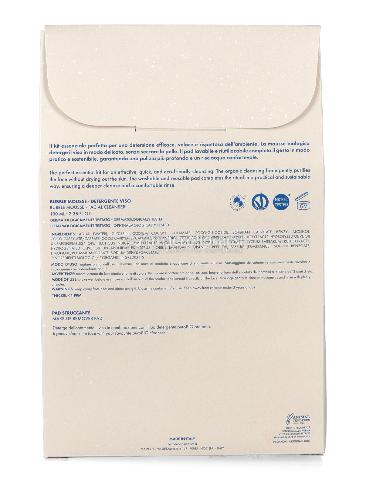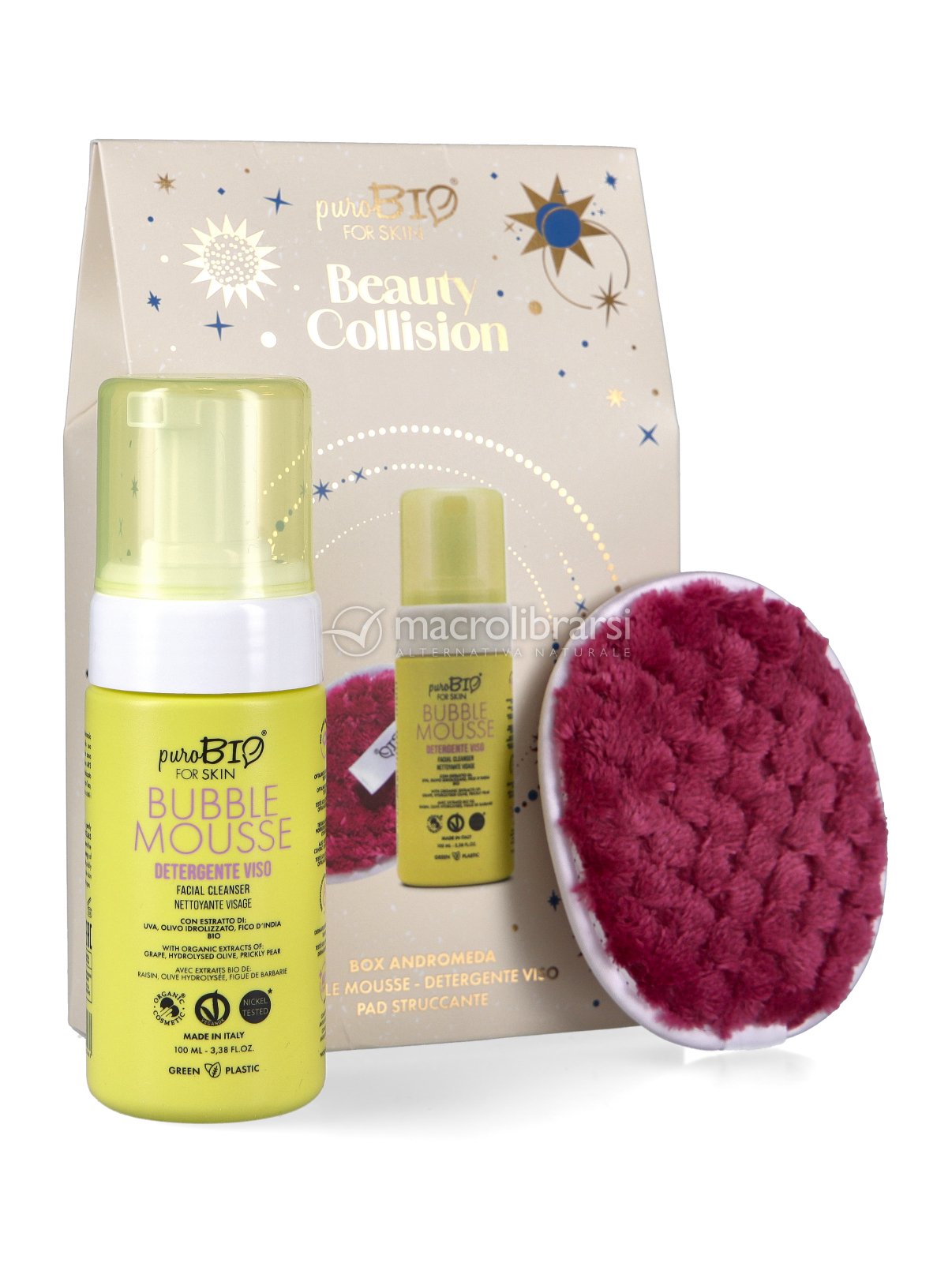 | Confezione | Mousse detergente (100 ml) + Pad struccante |