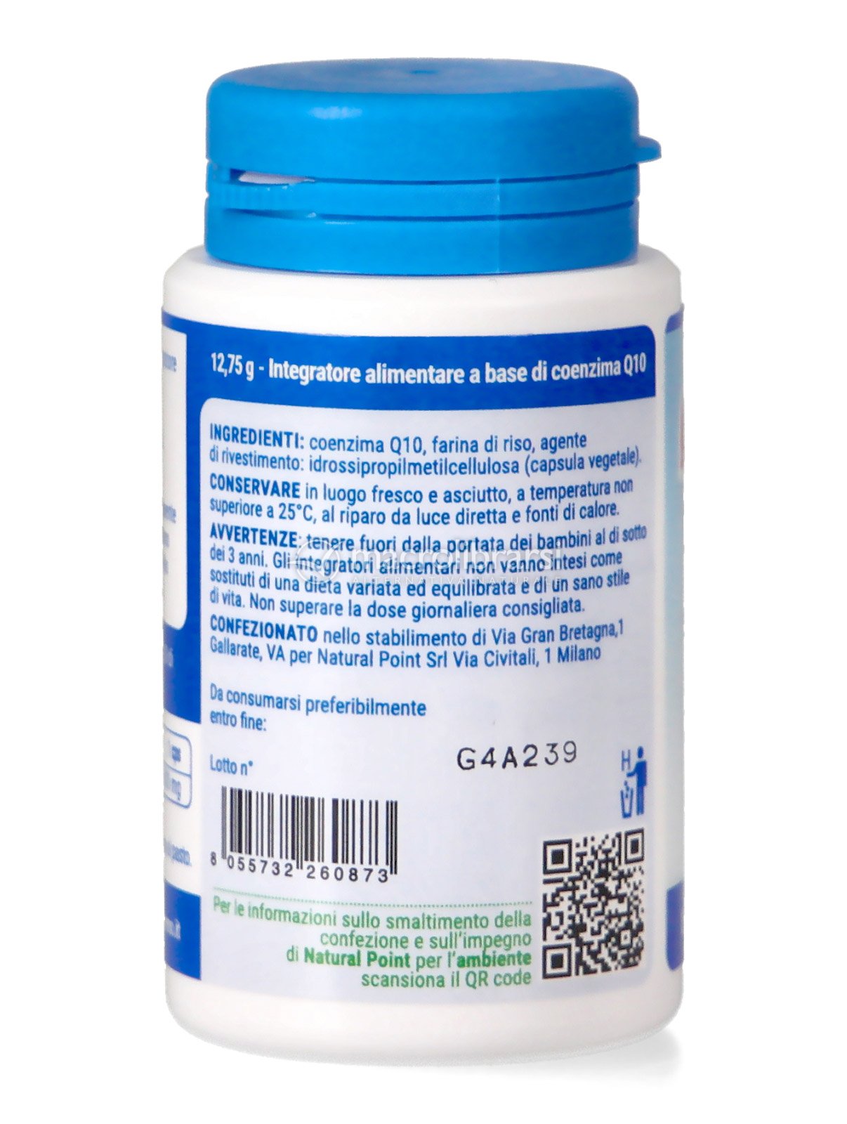 Q10 100 di Natural Point è un integratore con Coenzima Q10 ottenuto da fermentazione dello zucchero di canna.