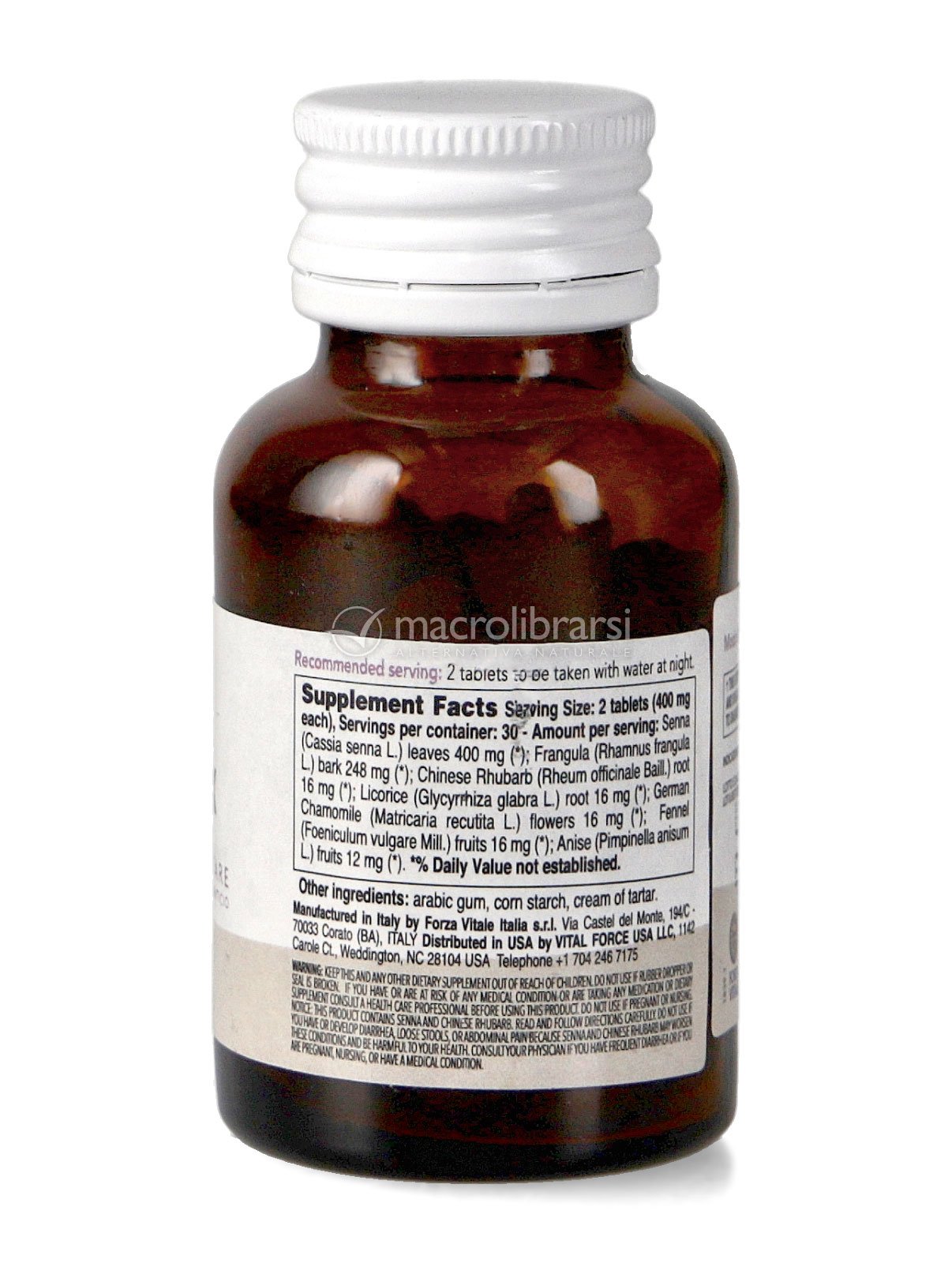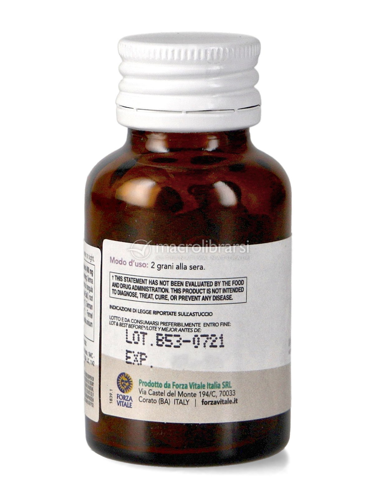 | Disclaimer | Non superare la dose giornaliera consigliata. Gli integratori alimentari non vanno intesi come sostituti di una dieta variata ed equilibrata. Tenere fuori dalla portata dei bambini al di sotto dei tre anni. Non utilizzare in gravidanza e nei bambini o comunque per periodi prolungati senza sentire il parere del medico. Conservare in luogo asciutto e lontano da fonti di calore. Richiudere la confezione dopo l'uso. Macrolibrarsi ricorda l'importanza di seguire uno stile di vita sano e un'alimentazione variata ed equilibrata. |