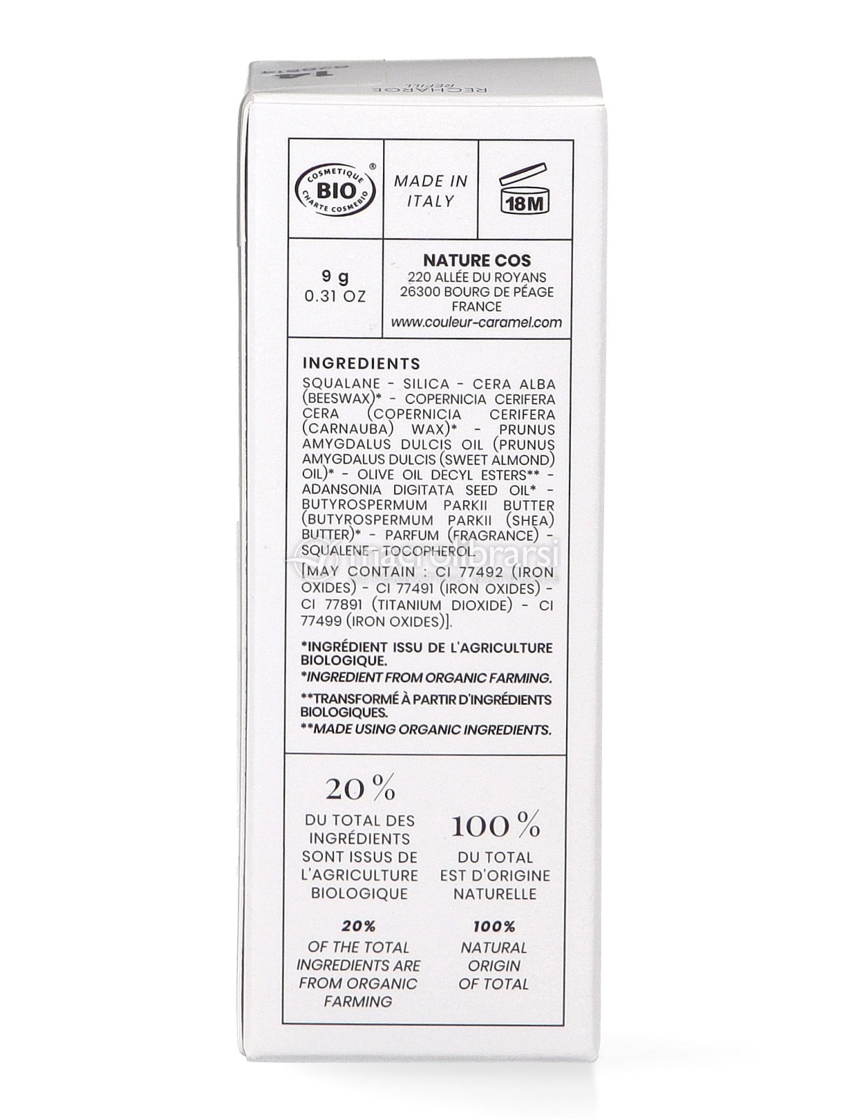 Squalane, Silica, Cera Alba (Beeswax)*, Copernicia Cerifera Cera (Copernicia Cerifera (Carnauba) Wax)*, Prunus Amygdalus Dulcis oil (Prunus Amygdalus Dulcis (Sweet Almond) oil)*, Olive oil Decyl Esters**, Adansonia Digitata Seed oil, Butyrospermum Parkii Butter (Butyrospermum Parkii (Shea) Butter)*, Parfum (Fragrance), Squalene, Tocopherol. [+ / - May Contain : Ci 77492 (Iron Oxides) - Ci 77491 (Iron Oxides) - Ci 77891 (Titanium Dioxide) - Ci 77499 (Iron Oxides)] *agricoltura biologica