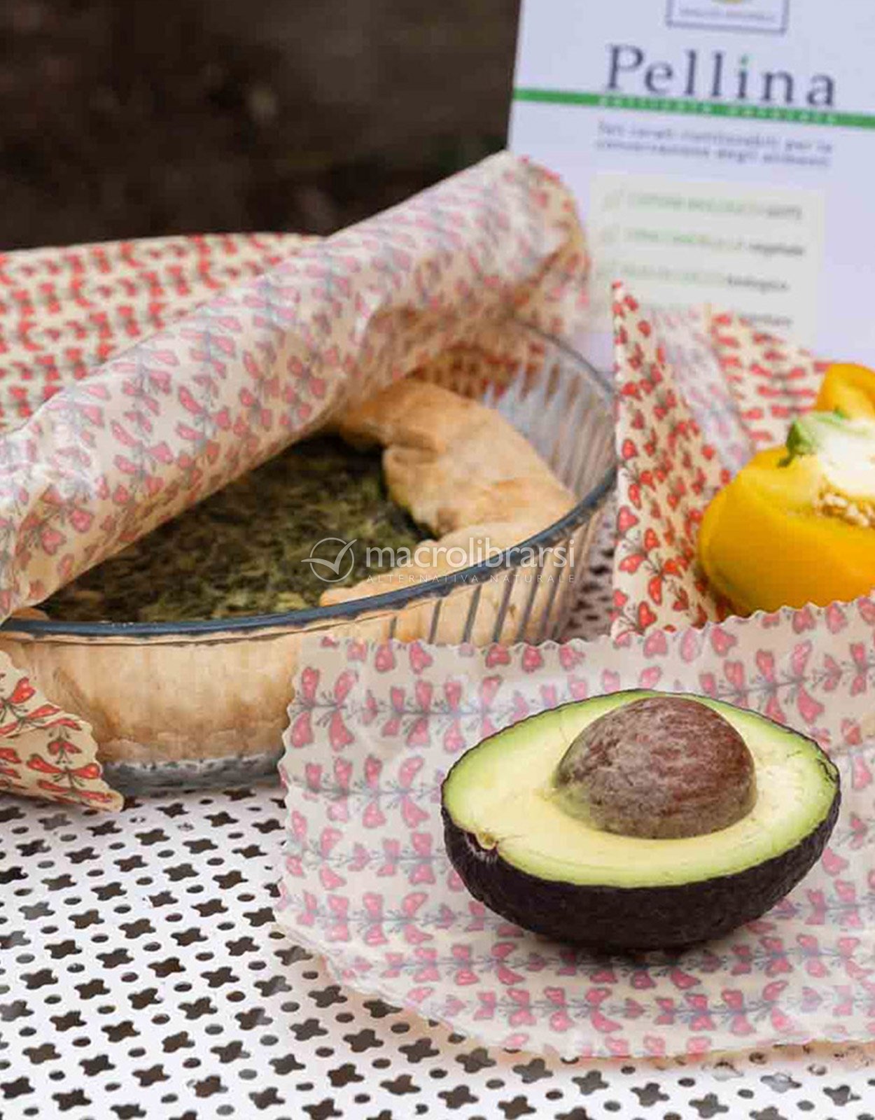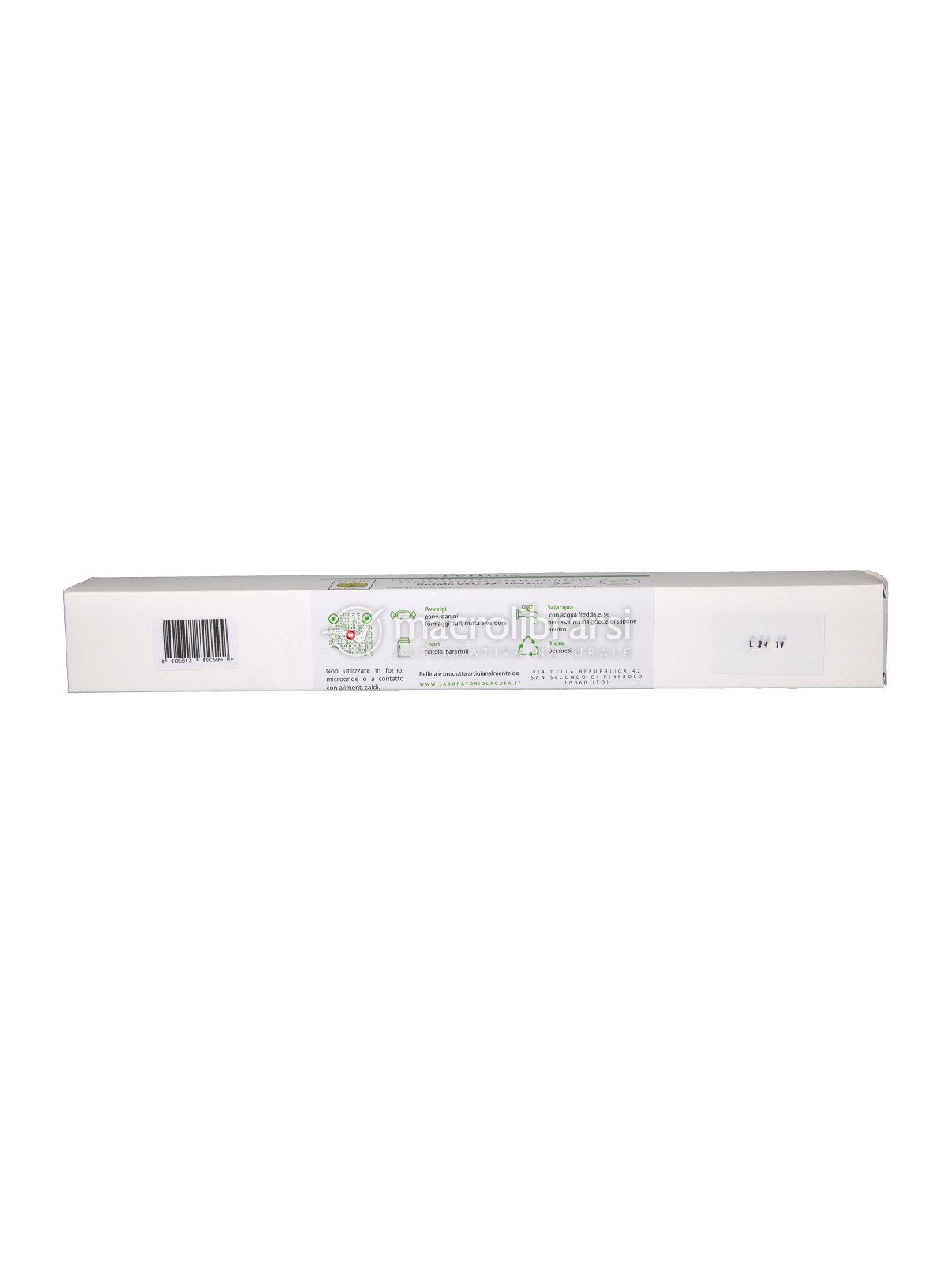 La pellicola è realizzata con materiali 100% ecosostenibili e biodegradabili: Cotone GOTS, cera Candelilla, olio di cocco biologico e resina di pino ad uso alimentare