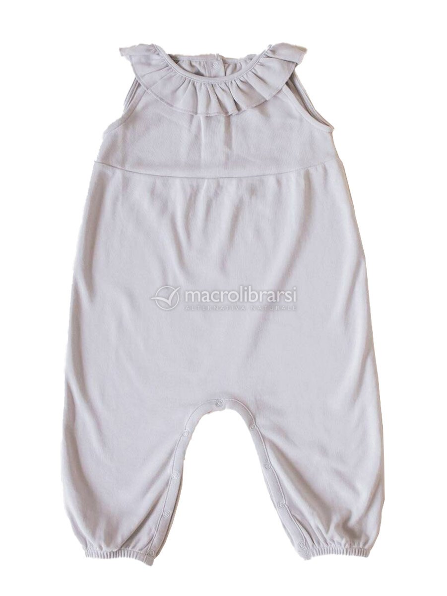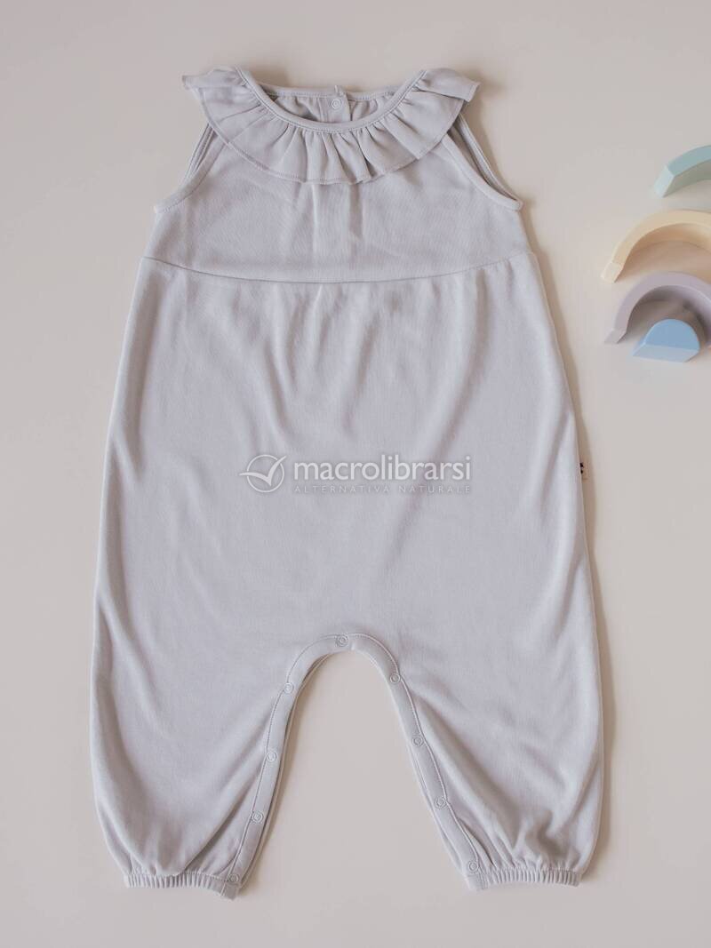 Salopette grigio perla con volant, molto morbida e comoda, perfetta per imparare a gattonare.