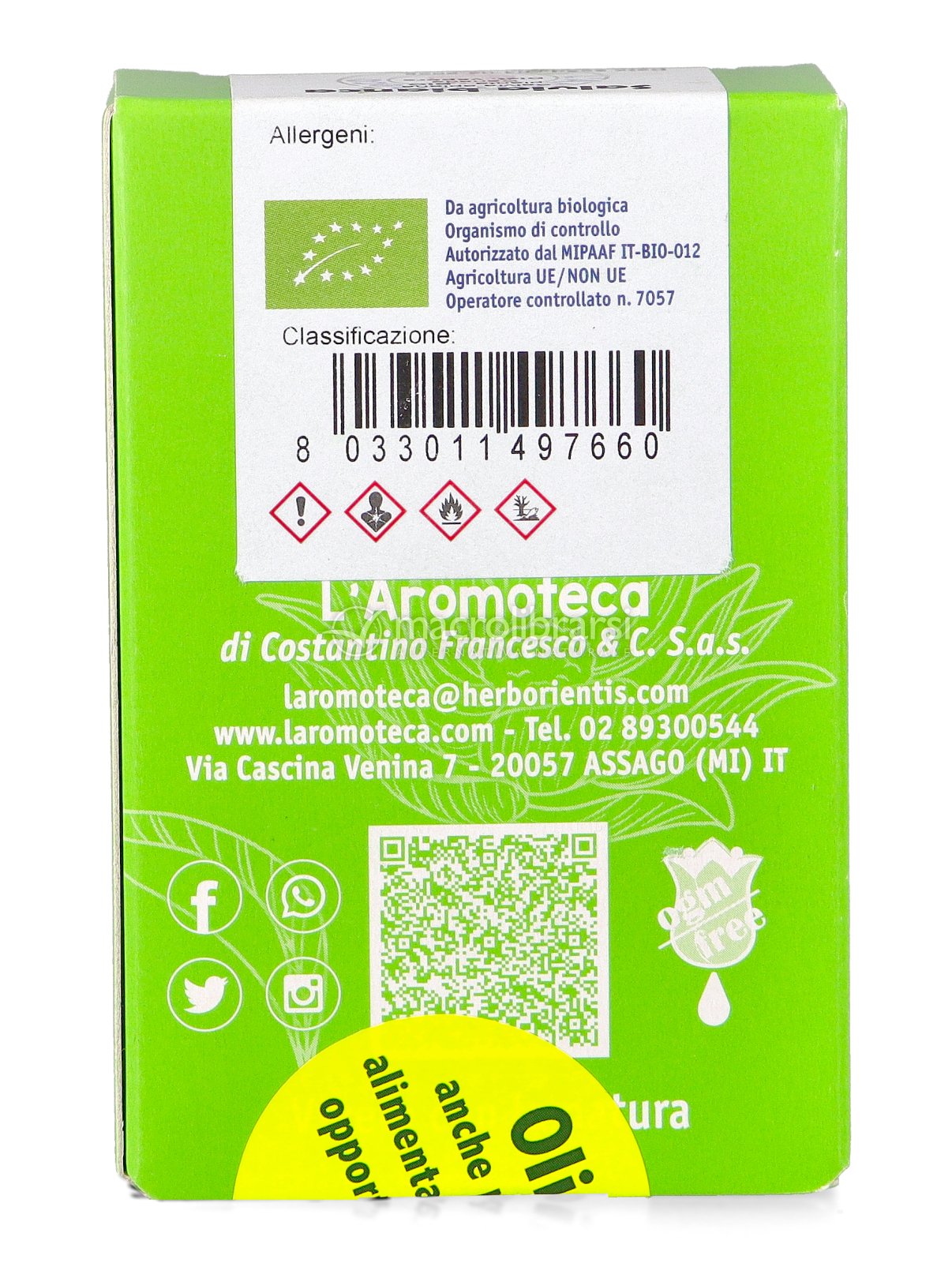 Disclaimer | Non superare la dose giornaliera consigliata. Gli oli essenziali sono sostanze concentrate e non vanno usati puri ma diluiti in un olio vegetale. Evitare il contatto con occhi e mucose. Tenere fuori dalla portata dei bambini al di sotto dei tre anni. Per l’utilizzo in gravidanza e nei bambini o comunque per periodi prolungati si consiglia di sentire il parere del medico. Conservare in luogo asciutto e lontano da fonti di calore. Richiudere la confezione dopo l'uso. Macrolibrarsi ricorda l'importanza di seguire uno stile di vita sano e un'alimentazione variata ed equilibrata. |