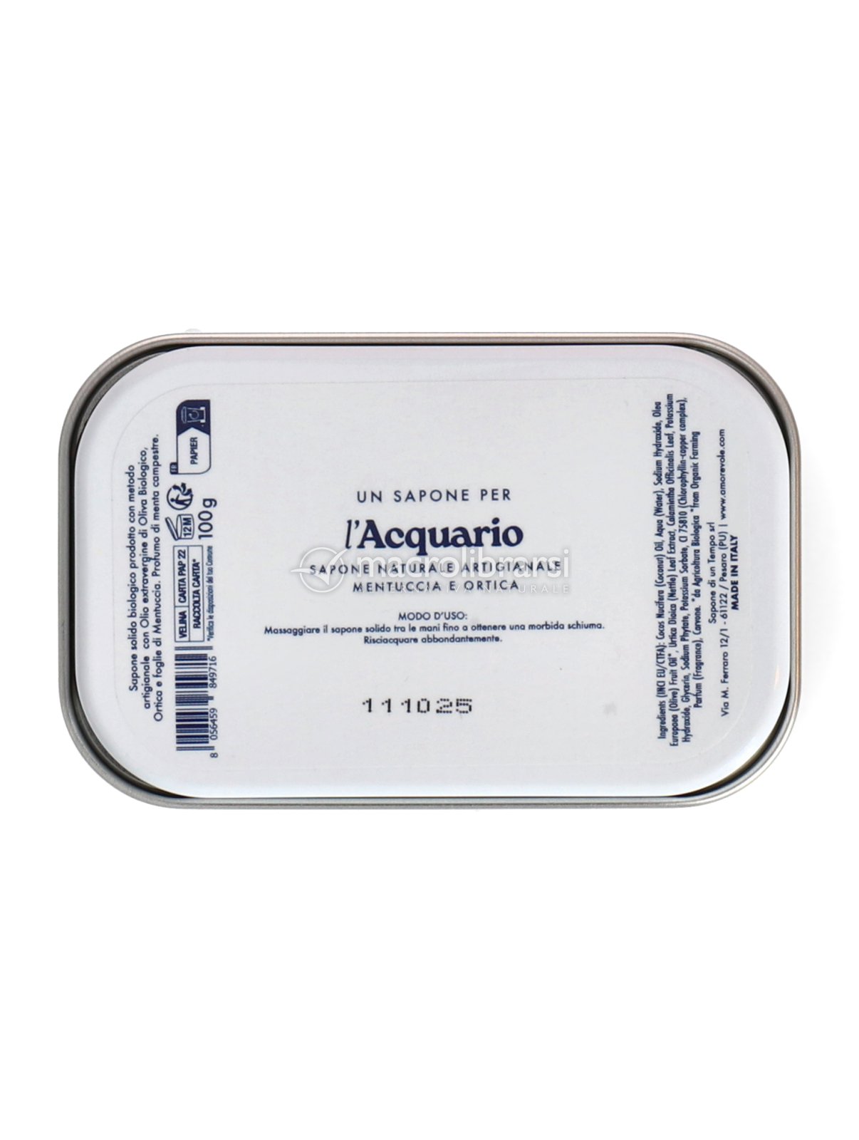 | Formato | Sapone biologico 100 g in scatola di latta (9,5 x 6 x 3 cm) |