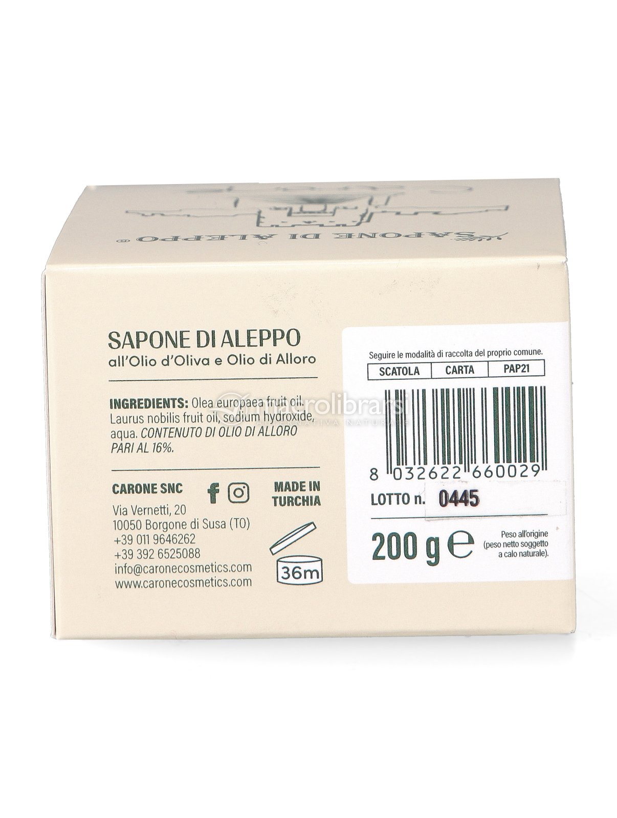 | Note | La provenienza del prodotto può variare dipendentemente dalla disponibilità del fornitore Note del produttoreIl sapone di Aleppo è un sapone essiccato all’aria, non contiene stabilizzanti nella formula. Il sapone non si asciuga, la motivazione è il tasso di umidità contenuta nell’aria. Il bagno può essere un locale con un’umidità elevata che non permette di far evaporare l’acqua. Consigliamo, se possibile di farlo asciugare all’aria (finestra; balcone). Se questa soluzione resta difficile, riporre la saponetta in un sacchetto/manopola in tessuto asciutto, la quale assorbirà l’eccesso di acqua, permettendo al sapone di asciugarsi. |
