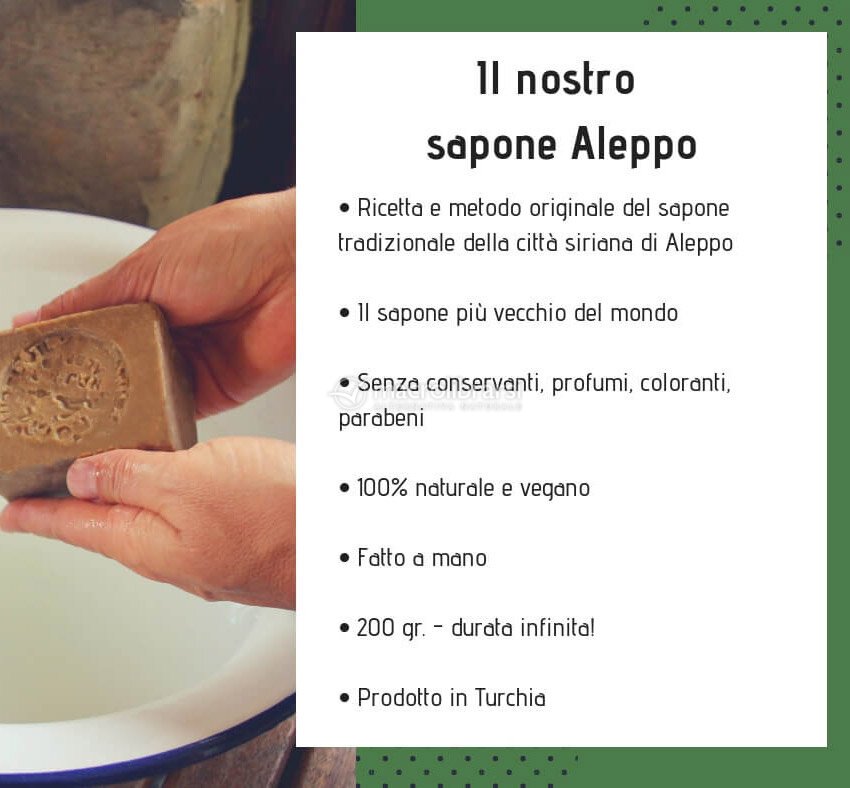 Il Sapone di Aleppo è un sapone proveniente dalla tradizione siriana della città di Aleppo. I suoi ingredienti e la sua lavorazione artigianale millenaria sono rimasti invariati nel tempo creando così, un prodotto unico nel suo genere.
