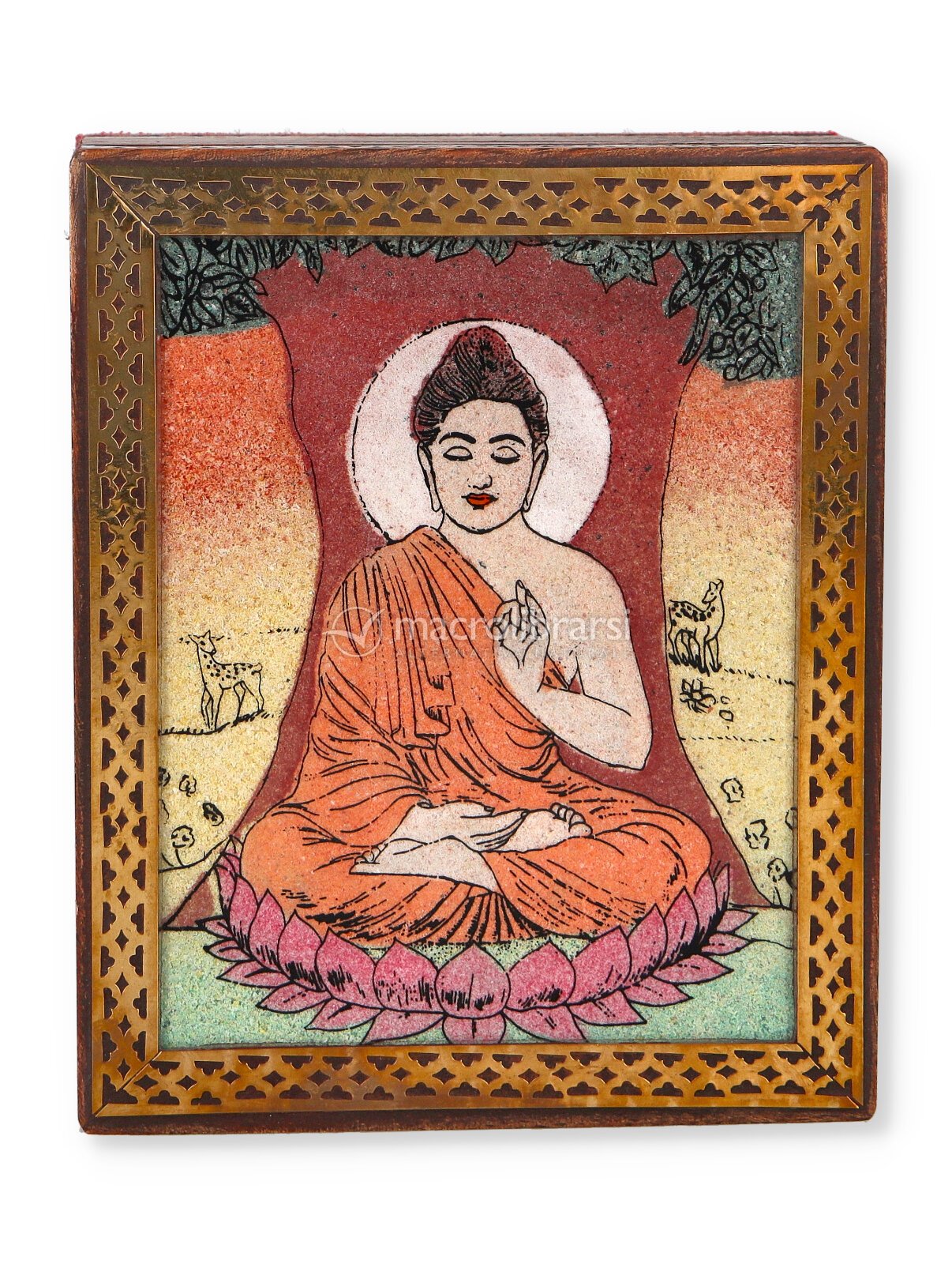 Scatola decorativa in legno di mango con un disegno in sabbia del Buddha sotto un albero di Bodhi, che mostra il mudra dell'insegnamento.