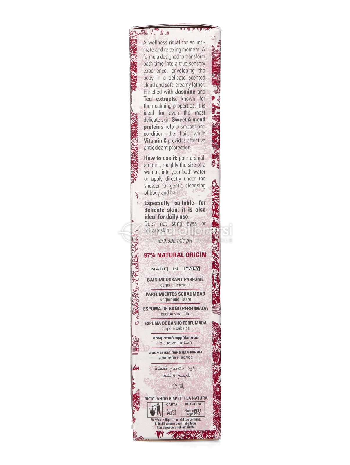 Arricchita con estratti di Gelsomino e Tè, dalle note proprietà lenitive e calmanti, è ideale anche per le pelli più sensibili. Le proteine di Mandorle Dolci disciplinano e proteggono i capelli, lasciandoli morbidi e setosi, mentre la Vitamina C svolge un’azione antiossidante e rivitalizzante, contribuendo a mantenere la pelle luminosa e tonica.