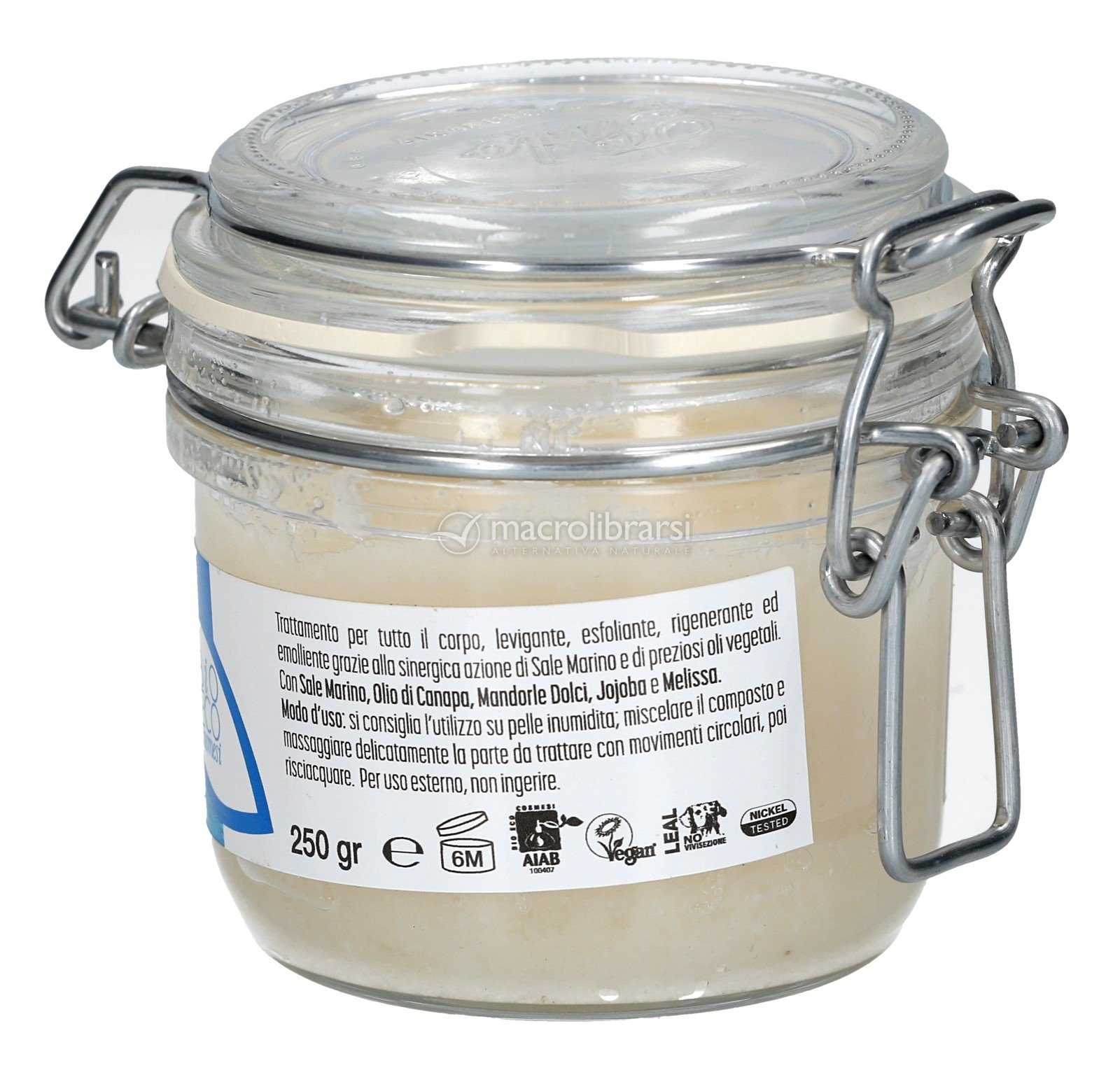 Il Sale Marino, dalle note proprietà riequilibranti e purificanti, attraverso il massaggio, esercita un’azione meccanica di eliminazione delle cellule morte che si accumulano sulla superficie della pelle e che la rendono ruvida ed impoverita. Il Sale ha, inoltre, una funzione di rimozione delle impurità della pelle; aiuta a contrastare l’insorgenza di peli incarniti e punti neri e lascia la pelle levigata.
