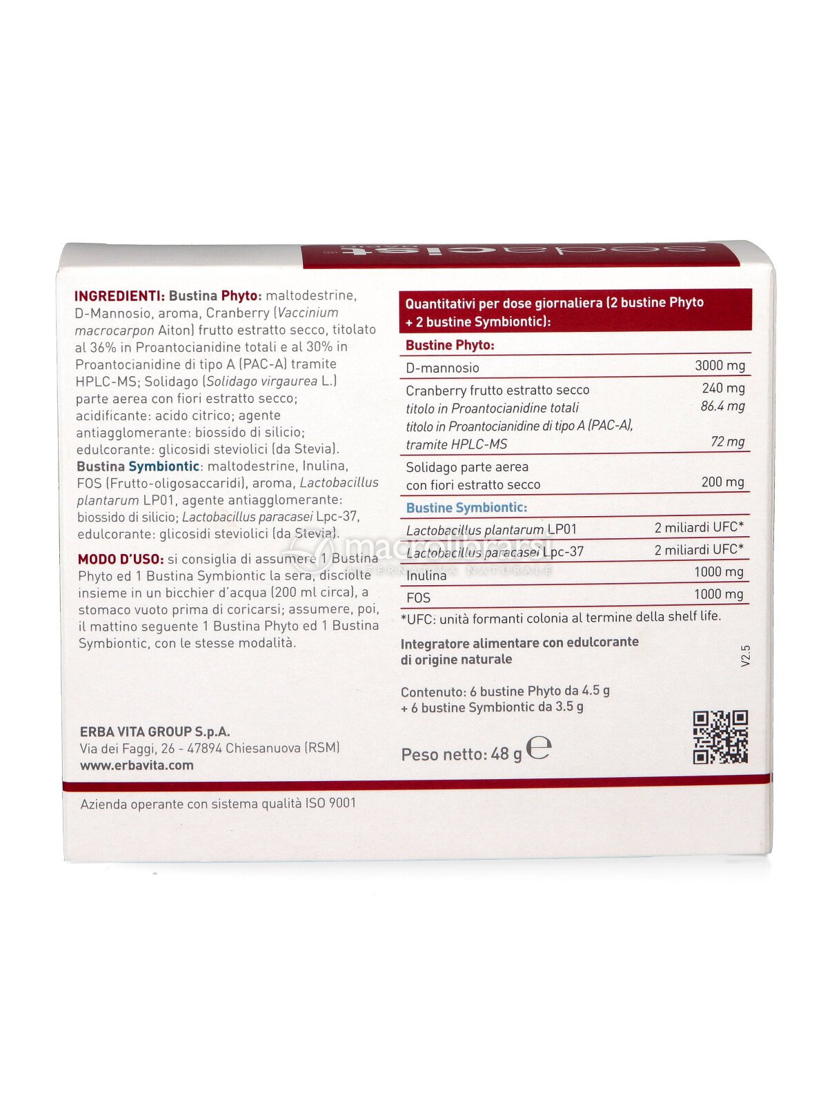 Il prodotto contiene due tipi di bustine, Phyto e Symbiotic, separate all'interno della confezione, ma da assumere assieme per un'effetto sinergico degli ingredienti.