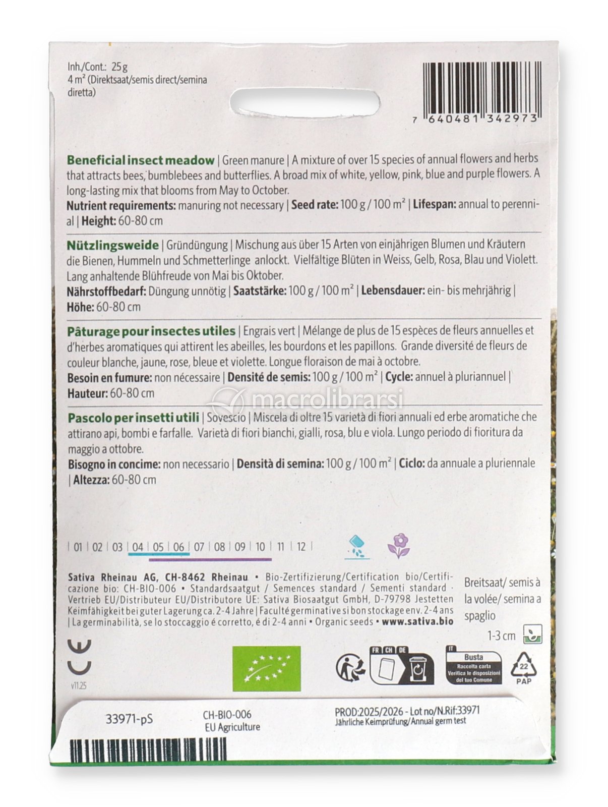 Composizione: Miscela esemplificativa - girasole piccolo, velo di sposa semplice bianco, cartamo, calendula arancione, nigella damascena verde, melissa moldavica, malva, ervo, fiordaliso bianco, rosa, blu, coriandolo, miscela di cosmea, vedovella, salvia nemorosa, vedovina a foglie sottili, malva selvatica, primula dei prati, garofanino minore, salvia