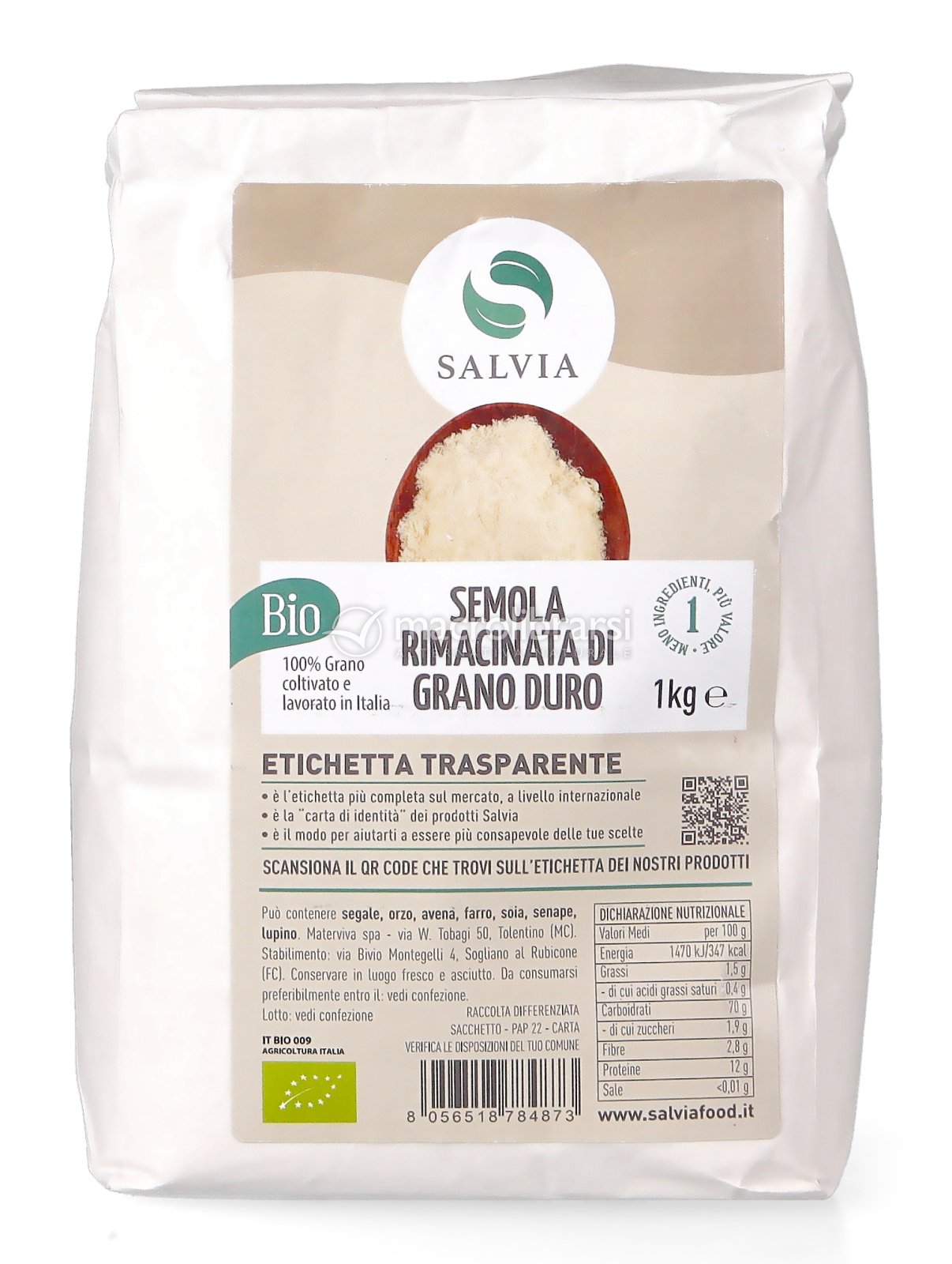 La Semola rimacinata di Salvia è ottenuta dalla molitura di grano duro italiano. Per i suoi valori nutrizionali, quella ottenuta dalla sua macinazione è una semola facilmente digeribile, grazie al suo ridotto indice di glutine, e particolarmente indicata per la panificazione.