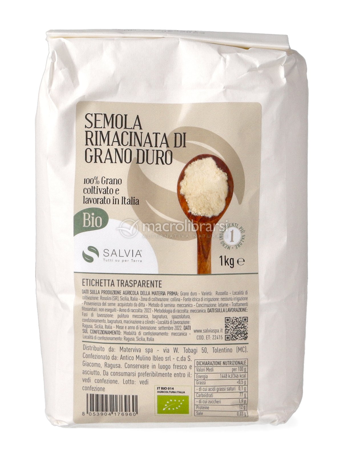 La Semola rimacinata di Salvia è ottenuta dalla molitura di grano duro. La varietà impiegata è il Russello, una tra le quattro varietà di grano antico siciliano, riconoscibile per le sue alte spighe di colore rosso acceso. Per i suoi valori nutrizionali, quella ottenuta dalla sua macinazione è una semola facilmente digeribile, grazie al suo ridotto indice di glutine, e particolarmente indicata per la panificazione.