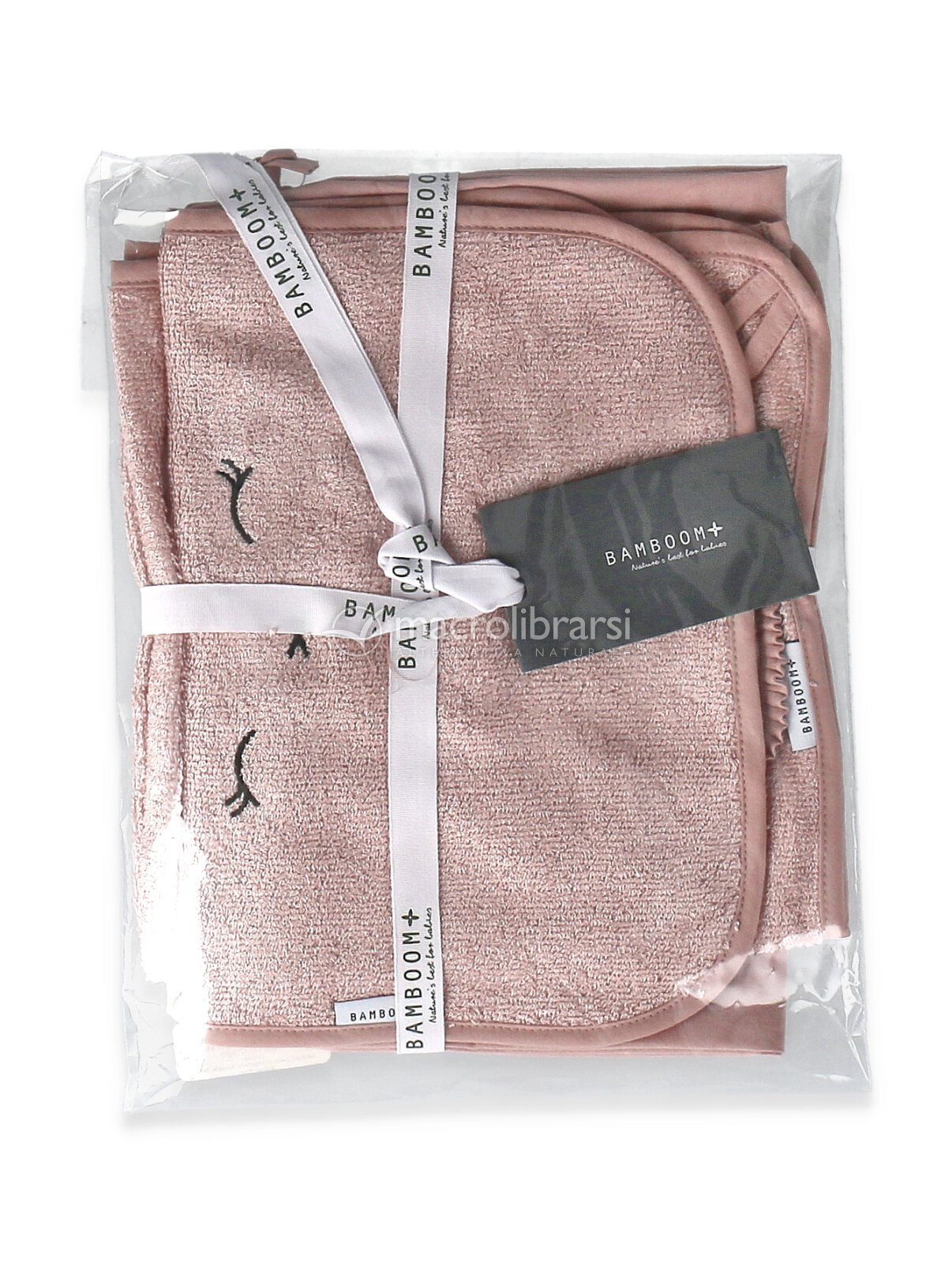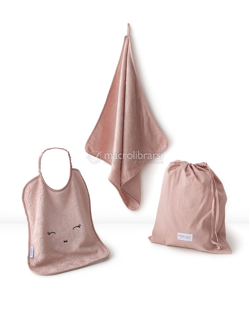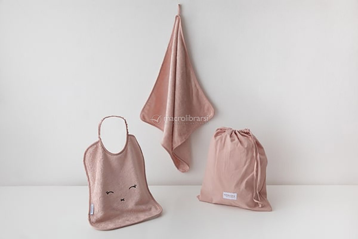 Set per l'asilo in versione rosa, composto da un bavaglino e da un asciugamano in morbidissima spugna di bambù organico e da una pratica sacca per trasportarli.