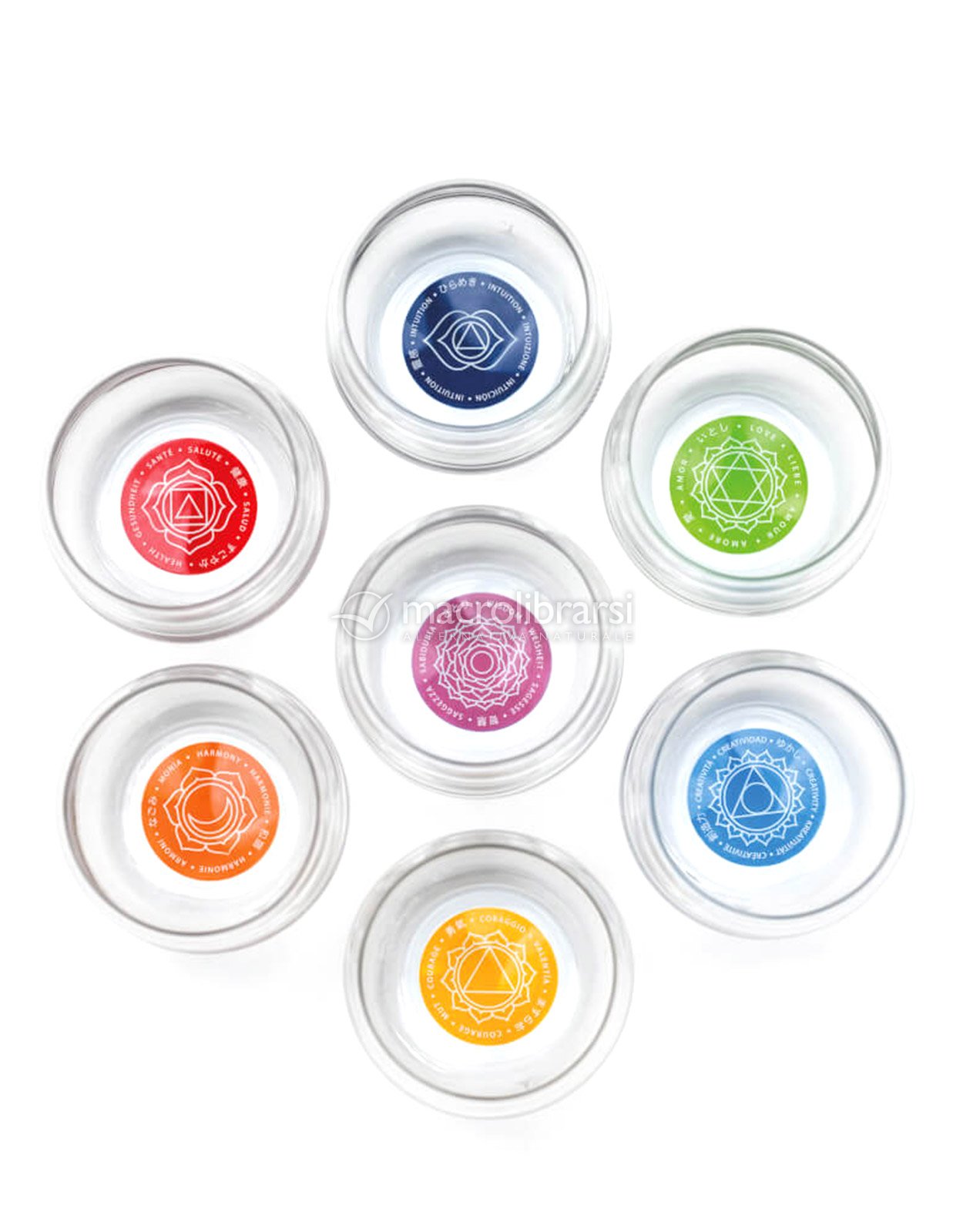 - Nel fondo sono "iniettati" ad alte temperature i sacri simboli dei sette Chakra con il relativo colore
