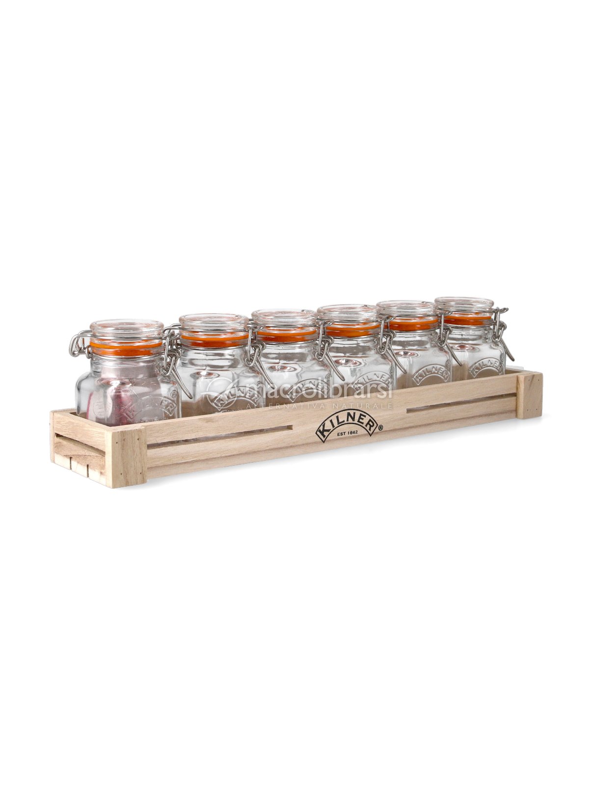 | Confezione | Confezione: 6 barattoli Kilner® Clip Top 70ml + 1 cassetta di legno + 12 etichette + 1 libretto di ricette. |