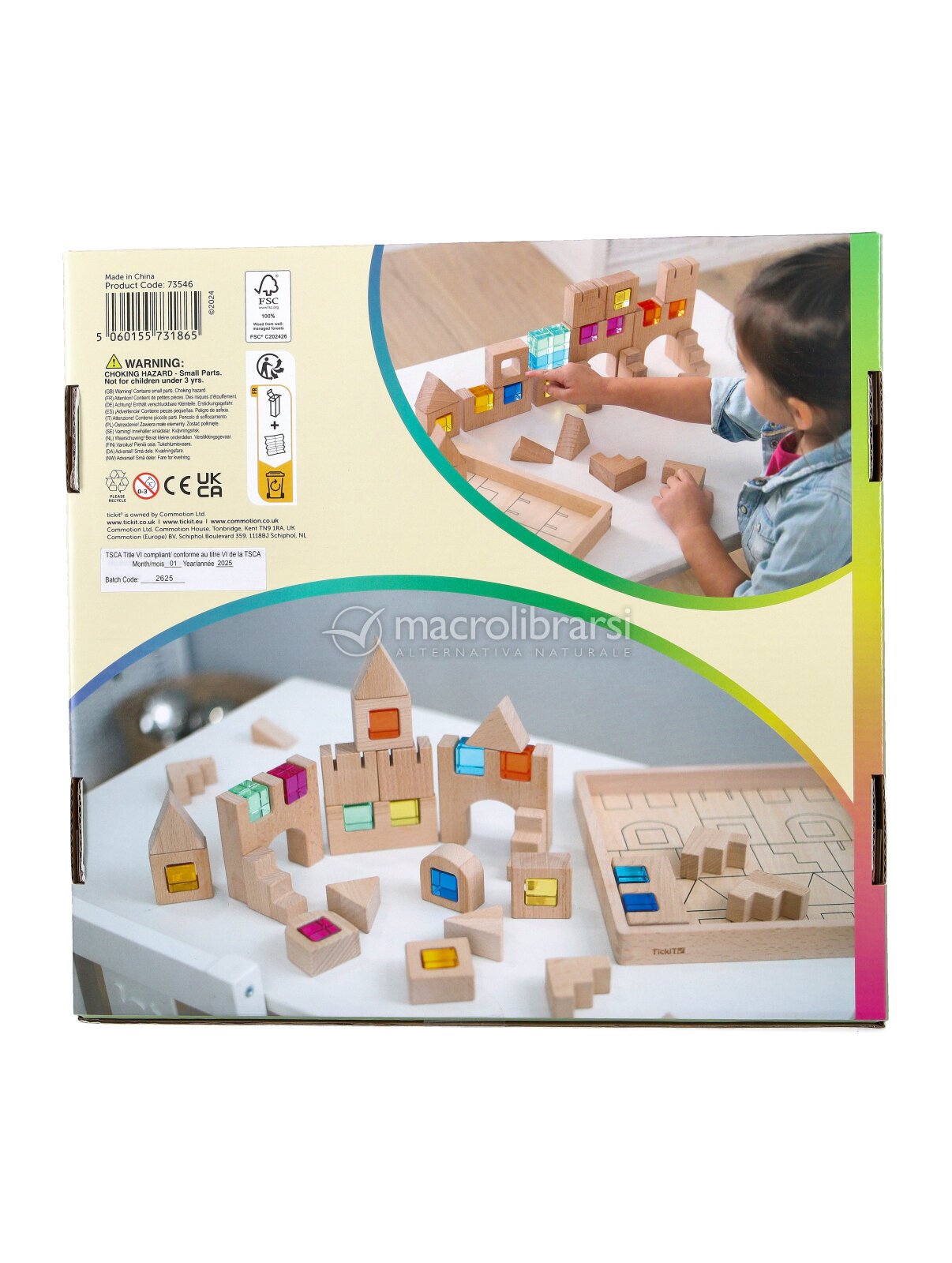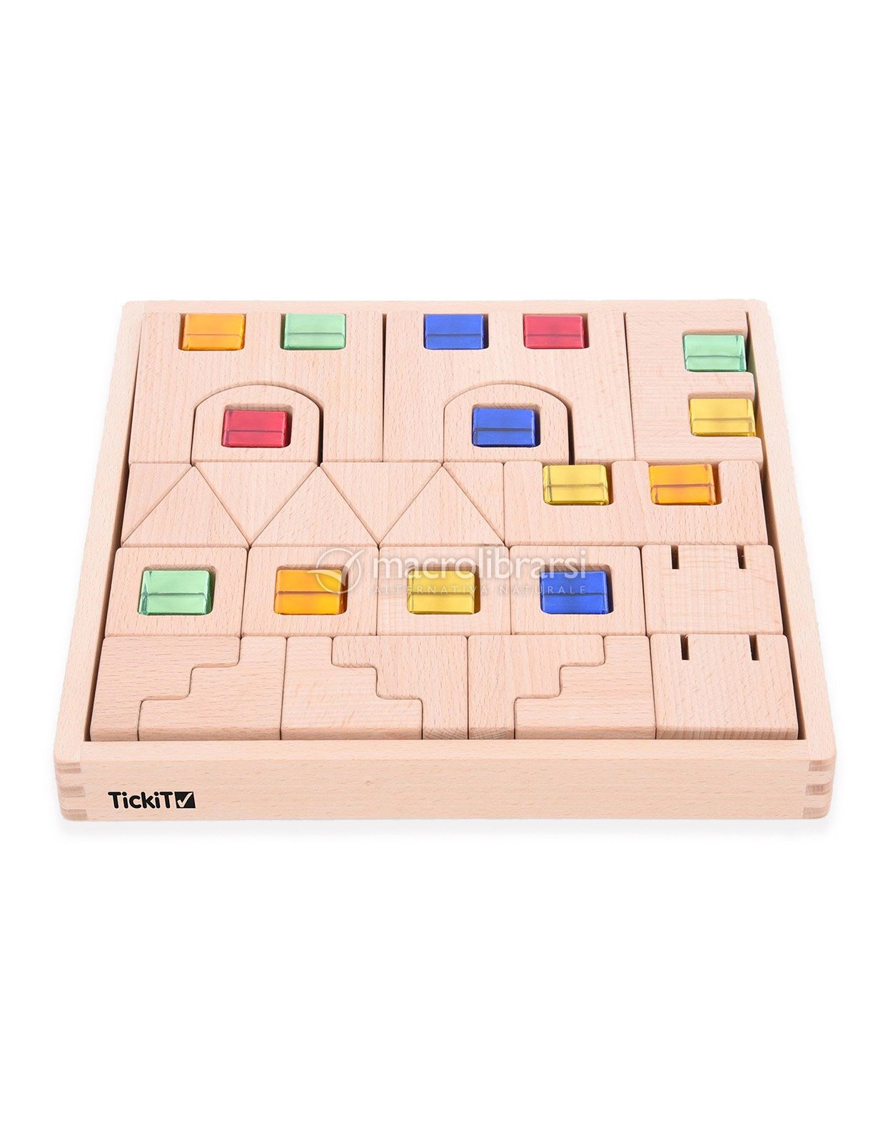 Il set include 25 blocchi in legno di faggio certificato FSC, 14 gemme acriliche colorate e un vassoio dove riporre tutti i mattoncini a incastro.