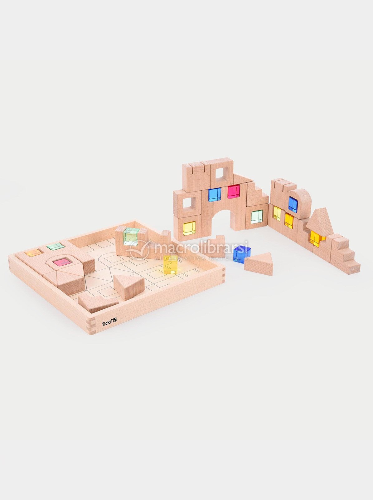 Set composto da blocchi in legno e acrilico colorato con cui costruire strutture sempre nuovi e accattivanti.