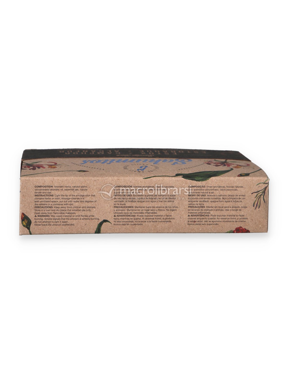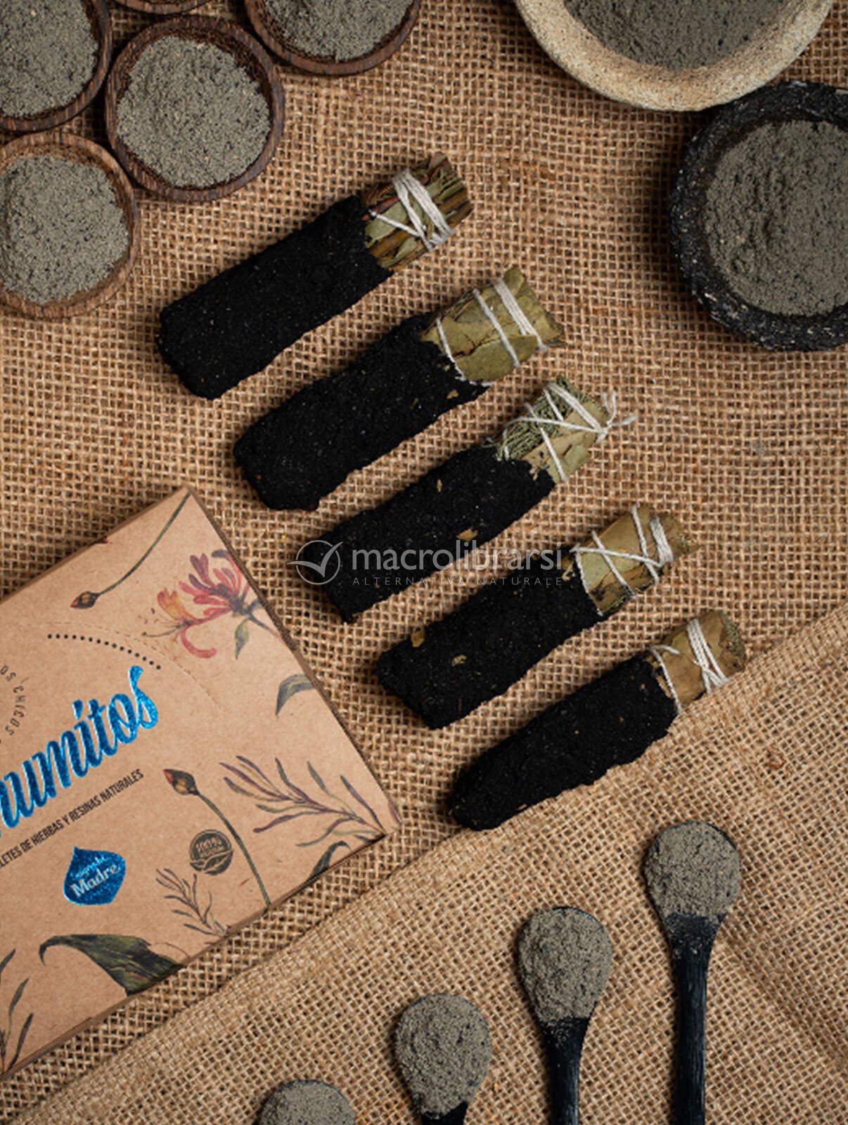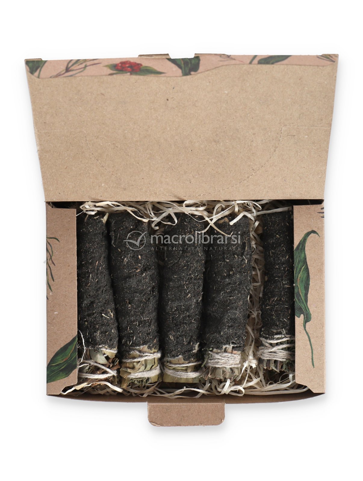 La composizione comprende erbe aromatiche, resine naturali, olio aromatico concentrato, legante naturale e sale, selezionati per offrire una profumazione intensa e persistente. Ogni confezione contiene circa 5 unità e garantisce una durata complessiva di circa 2 ore.