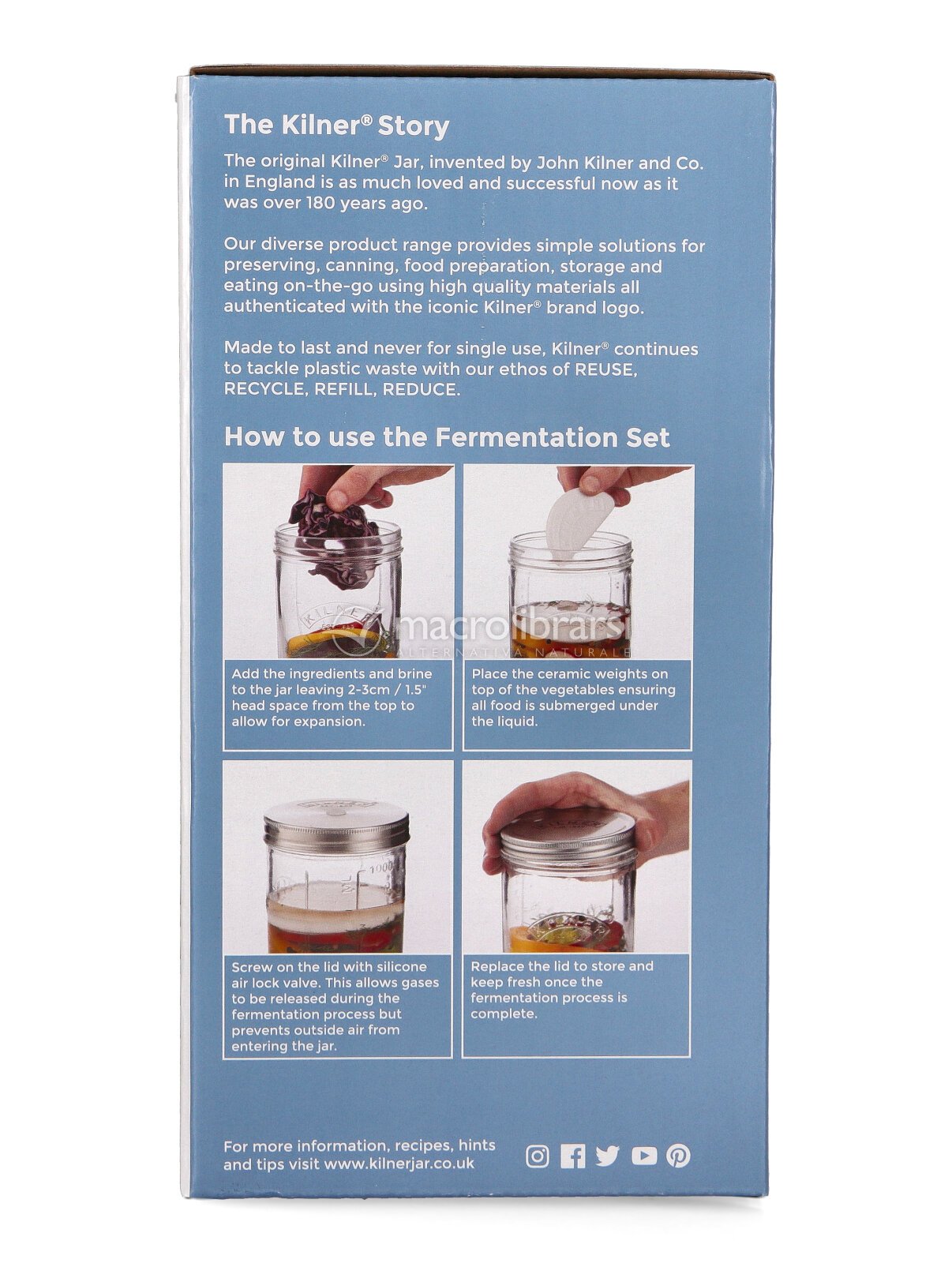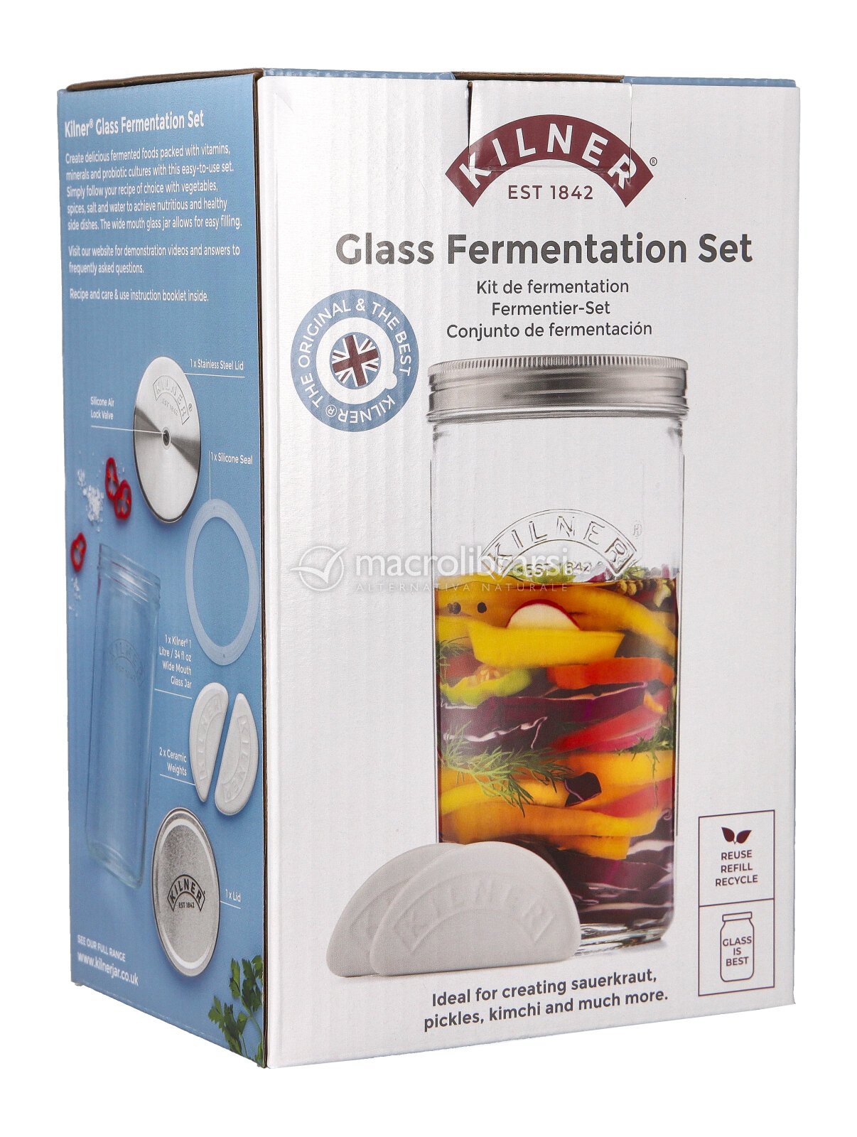 | Confezione | 1 barattolo Kilner® a bocca larga da 1 litro + 1 coperchio in acciaio inossidabile con valvola di sicurezza + 1 coperchio monoblocco in acciaio inossidabile + 2 pesi in ceramica + 1 anello in silicone + 1 libretto di ricette |