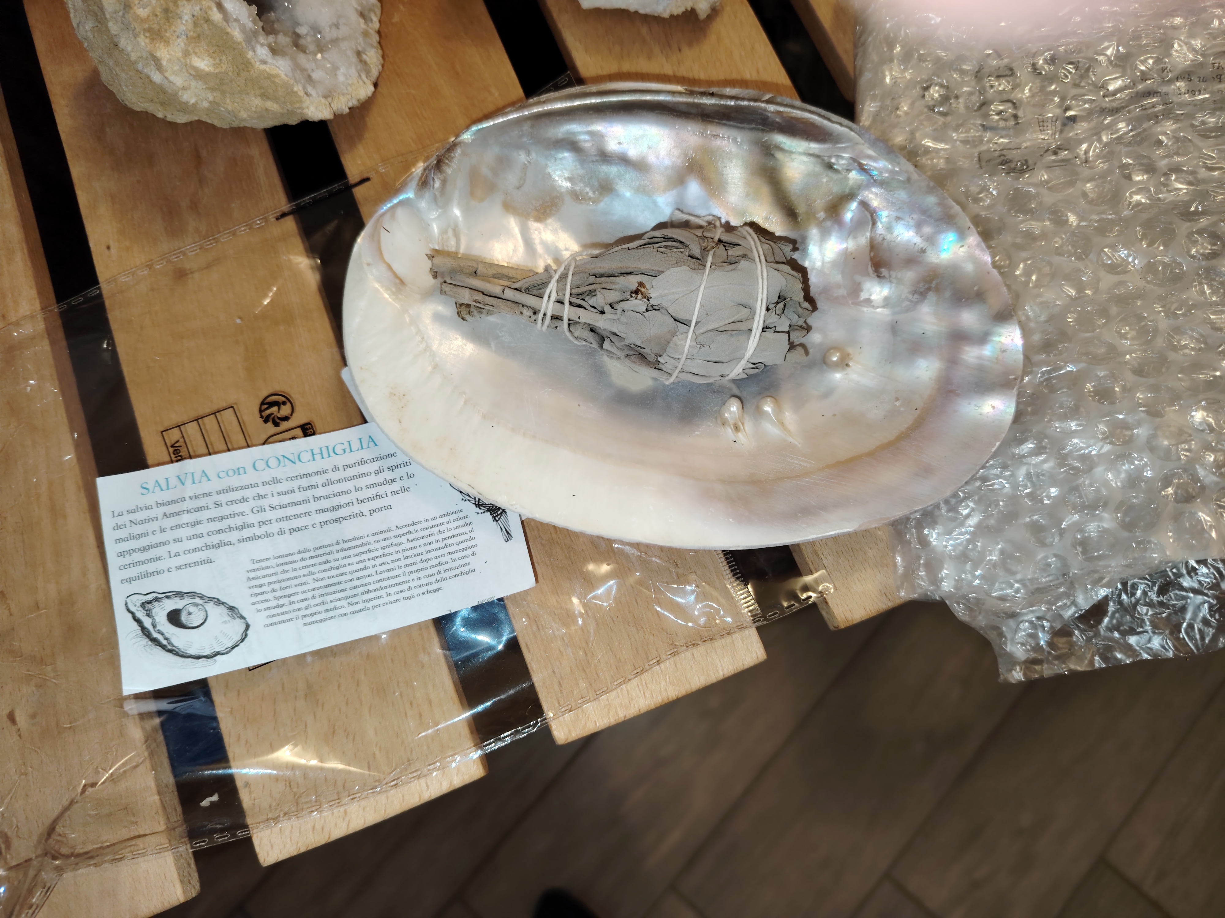 | Confezione | 1 conchiglia di madreperla (da raccolta sostenibile) + 1 smudge stick di Salvia Bianca |