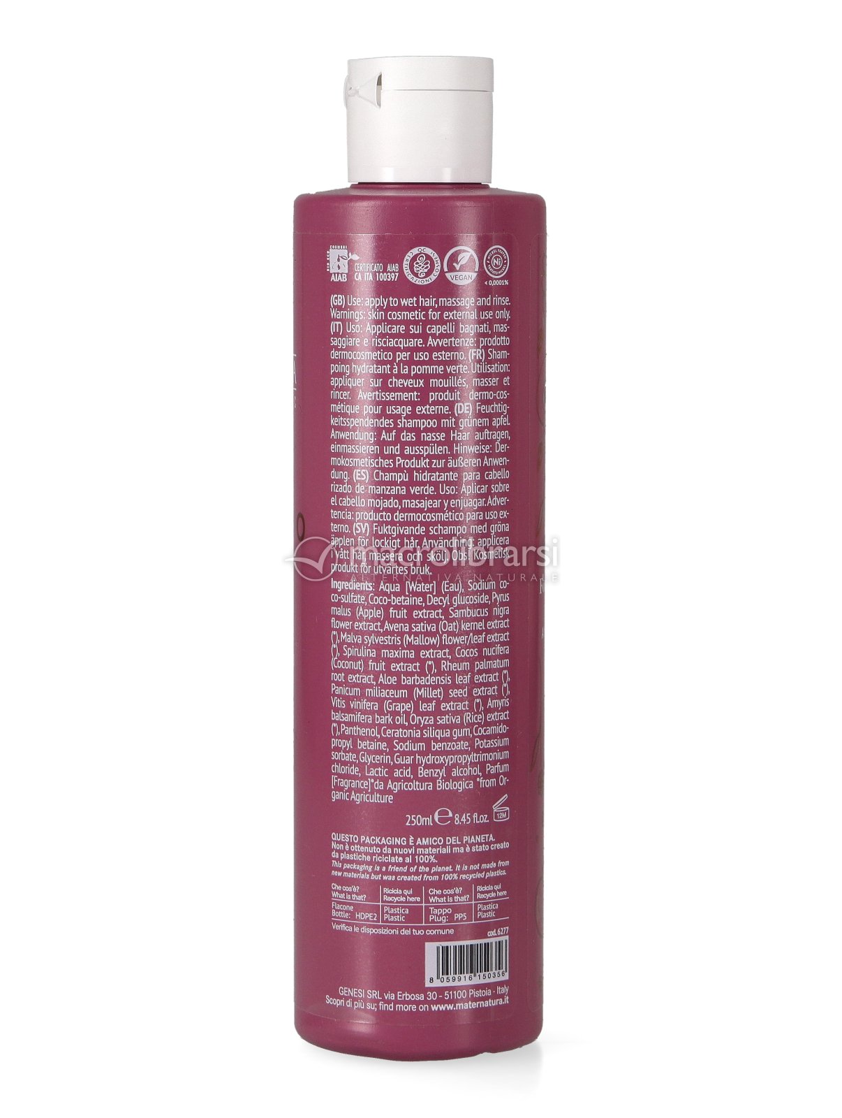 Tensioattivi vegetali detergono delicatamente e in profondità, gli estratti di mela verde assicurano che i capelli rimangano ben idratati, il pantenolo li rende morbidi ed elastici e ne aumenta la resistenza, mentre l'olio di cocco dona una lucentezza setosa e definisce i ricci.
